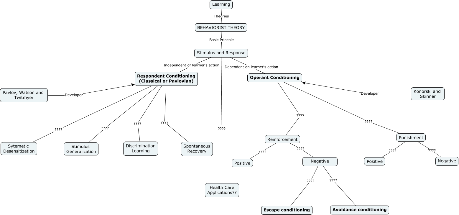 This Concept Map, created with IHMC CmapTools, has information related to: Behaviorist Theory V 2.0, Respondent Conditioning (Classical or Pavlovian) ???? Sytemetic Desensitization, Punishment ???? Positive, Reinforcement ???? Negative, Negative ???? Avoidance conditioning, Learning Theories BEHAVIORIST THEORY, Konorski and Skinner Developer Operant Conditioning, BEHAVIORIST THEORY Basic Princple Stimulus and Response, Operant Conditioning ???? Reinforcement, Punishment ???? Negative, Negative ???? Escape conditioning, Respondent Conditioning (Classical or Pavlovian) ???? Stimulus Generalization, Stimulus and Response Dependent on learner's action Operant Conditioning, Operant Conditioning ???? Punishment, Pavlov, Watson and Twitmyer Developer Respondent Conditioning (Classical or Pavlovian), Respondent Conditioning (Classical or Pavlovian) ???? Discrimination Learning, Stimulus and Response Independent of learner's action Respondent Conditioning (Classical or Pavlovian), Stimulus and Response ???? Health Care Applications??, Respondent Conditioning (Classical or Pavlovian) ???? Spontaneous Recovery, Reinforcement ???? Positive