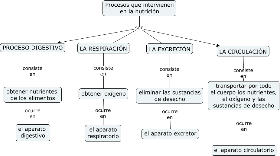 Este Cmap, tiene información relacionada con: Procesos que intervienen en la nutrición, obtener oxígeno ocurre en el aparato respiratorio, PROCESO DIGESTIVO consiste en obtener nutrientes de los alimentos, LA RESPIRACIÓN consiste en obtener oxígeno, LA CIRCULACIÓN consiste en transportar por todo el cuerpo los nutrientes, el oxígeno y las sustancias de desecho, Procesos que intervienen en la nutrición son PROCESO DIGESTIVO, Procesos que intervienen en la nutrición son LA RESPIRACIÓN, LA EXCRECIÓN consiste en eliminar las sustancias de desecho, eliminar las sustancias de desecho ocurre en el aparato excretor, transportar por todo el cuerpo los nutrientes, el oxígeno y las sustancias de desecho ocurre en el aparato circulatorio, obtener nutrientes de los alimentos ocurre en el aparato digestivo, Procesos que intervienen en la nutrición son LA EXCRECIÓN, Procesos que intervienen en la nutrición son LA CIRCULACIÓN