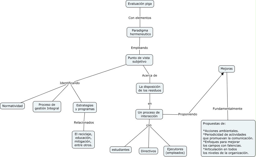 Este Cmap, tiene información relacionada con: mapapiga, Paradigma hermeneutico Empleando Punto de vista subjetivo, La disposición de los residuos en Un proceso de interacción, Punto de vista subjetivo Identificando Estrategias y programas, Un proceso de interacción con estudiantes, Evaluación piga Con elementos Paradigma hermeneutico, Un proceso de interacción con Directivos, Punto de vista subjetivo Identificando Normatividad, Mejoras Fundamentalmente Propuestas de: *Acciones ambientales. *Periodicidad de actividades que promuevan la comunicación. *Enfoques para mejorar los campos con falencias. *Articulación en todos los niveles de la organización., Punto de vista subjetivo Acerca de La disposición de los residuos, Un proceso de interacción con Ejecutores (empleados), Estrategias y programas Relacionados El reciclaje, educación, mitigación, entre otros., Un proceso de interacción Proponiendo Mejoras, Punto de vista subjetivo Identificando Proceso de gestión Integral