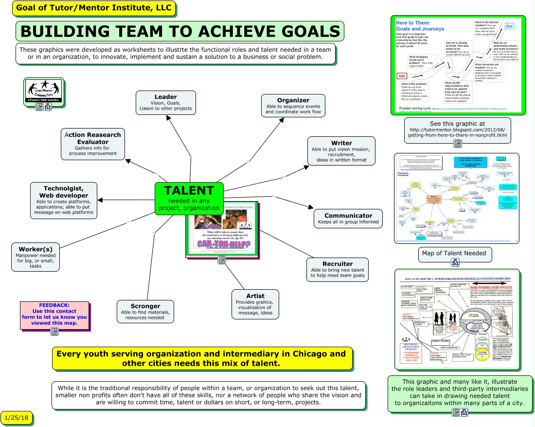 This Concept Map, created with IHMC CmapTools, has information related to: Building teams, TALENT needed in any project, organization - Action Reasearch Evaluator Gathers info for process improvement, TALENT needed in any project, organization - Organizer Able to sequence events and coordinate work flow, TALENT needed in any project, organization - Leader Vision, Goals, Liason to other projects, TALENT needed in any project, organization - Artist Provides grahics, visualization of message, ideas, TALENT needed in any project, organization - Worker(s) Manpower needed for big, or small, tasks, TALENT needed in any project, organization - Recruiter Able to bring new talent to help meet team goals, TALENT needed in any project, organization - Scronger Able to find materials, resources needed, TALENT needed in any project, organization - Writer Able to put vision mission, recruitment, ideas in written format, TALENT needed in any project, organization - Communicator Keeps all in group informed, TALENT needed in any project, organization - Technolgist, Web developer Able to create platforms, applications; able to put message on web platforms