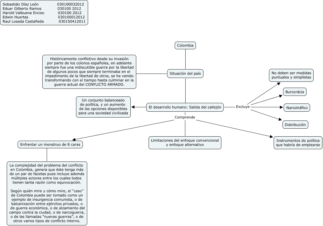 Este Cmap, tiene información relacionada con: Conflicto armado en Colombia, El desarrollo humano: Salida del callejón ???? Un conjunto balanceado de política, y un aumento de las opciones disponibles para una sociedad civilizada, El desarrollo humano: Salida del callejón Comprende Enfrentar un monstruo de 8 caras, Situación del país ???? Históricamente conflictivo desde su invasión por parte de los colonos españoles, en adelante siempre fue una indiscutible guerra por la libertad de algunos pocos que siempre terminaba en el impedimento de la libertad de otros, se ha venido transformando con el tiempo hasta culminar en la guerra actual del CONFLICTO ARMADO., El desarrollo humano: Salida del callejón Comprende Limitaciones del enfoque convencional y enfoque alternativo, El desarrollo humano: Salida del callejón Excluye No deben ser medidas puntuales y simplístas, Enfrentar un monstruo de 8 caras ???? La complejidad del problema del conflicto en Colombia, genera que éste tenga más de un par de facetas pues incluye además múltiples actores entre los cuales todos tienen tanta razón como equivocación. Según quién mire y cómo mire, el “caso” de Colombia puede ser tomado como un ejemplo de insurgencia comunista, o de balcanización entre ejércitos privados, o de guerra económica, o de alzamiento del campo contra la ciudad, o de narcoguerra, o de las llamadas “nuevas guerras”, o de otros varios tipos de conflicto interno., Colombia ???? Situación del país, El desarrollo humano: Salida del callejón Excluye Burocrácia, El desarrollo humano: Salida del callejón Excluye Narcotráfico, Situación del país El desarrollo humano: Salida del callejón, El desarrollo humano: Salida del callejón Comprende Instrumentos de política que habría de emplearse, El desarrollo humano: Salida del callejón Excluye Distribución