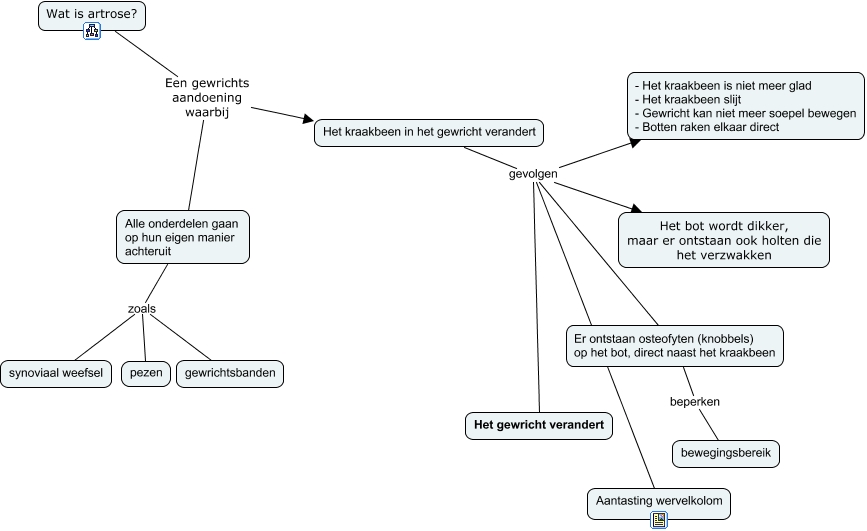 Deze Concept Map heeft informatie gerelateerd aan: Artrose - Wat is het, Het kraakbeen in het gewricht verandert gevolgen - Het kraakbeen is niet meer glad - Het kraakbeen slijt - Gewricht kan niet meer soepel bewegen - Botten raken elkaar direct, Het kraakbeen in het gewricht verandert gevolgen Er ontstaan osteofyten (knobbels) op het bot, direct naast het kraakbeen, Alle onderdelen gaan op hun eigen manier achteruit zoals synoviaal weefsel, Het kraakbeen in het gewricht verandert gevolgen Het bot wordt dikker, maar er ontstaan ook holten die het verzwakken, Het kraakbeen in het gewricht verandert gevolgen Aantasting wervelkolom, Alle onderdelen gaan op hun eigen manier achteruit zoals gewrichtsbanden, Alle onderdelen gaan op hun eigen manier achteruit zoals pezen, Wat is artrose? Een gewrichts aandoening waarbij Het kraakbeen in het gewricht verandert, Wat is artrose? Een gewrichts aandoening waarbij Alle onderdelen gaan op hun eigen manier achteruit, Er ontstaan osteofyten (knobbels) op het bot, direct naast het kraakbeen beperken bewegingsbereik, Het kraakbeen in het gewricht verandert gevolgen Het gewricht verandert