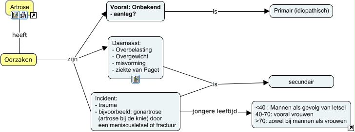 Deze Concept Map heeft informatie gerelateerd aan: Artrose - Oorzaken, Vooral: Onbekend - aanleg? is Primair (idiopathisch), Incident: - trauma - bijvoorbeeld: gonartrose (artrose bij de knie) door een meniscusletsel of fractuur is secundair, Artrose heeft Oorzaken, Oorzaken zijn Vooral: Onbekend - aanleg?, Daarnaast: - Overbelasting - Overgewicht - misvorming - ziekte van Paget is secundair, Oorzaken zijn Daarnaast: - Overbelasting - Overgewicht - misvorming - ziekte van Paget, Incident: - trauma - bijvoorbeeld: gonartrose (artrose bij de knie) door een meniscusletsel of fractuur jongere leeftijd ម : Mannen als gevolg van letsel 40-70: vooral vrouwen : zowel bij mannen als vrouwen, Oorzaken zijn Incident: - trauma - bijvoorbeeld: gonartrose (artrose bij de knie) door een meniscusletsel of fractuur