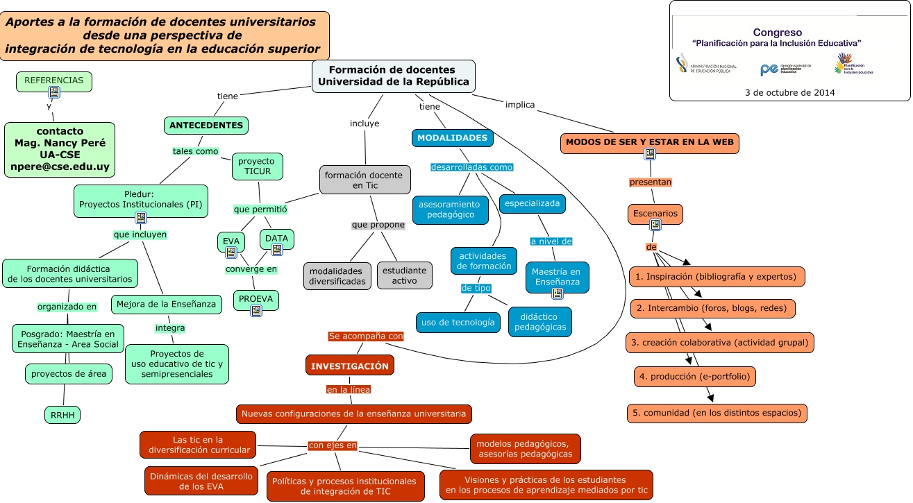 Este Cmap, tiene información relacionada con: anep-planificacion-2014, Formación de docentes Universidad de la República tiene MODALIDADES, Pledur: Proyectos Institucionales (PI) que incluyen Formación didáctica de los docentes universitarios, DATA converge en PROEVA, Mejora de la Enseñanza integra Proyectos de uso educativo de tic y semipresenciales, ANTECEDENTES tales como Pledur: Proyectos Institucionales (PI), proyecto TICUR que permitió EVA, Escenarios de 1. Inspiración (bibliografía y expertos), especializada a nivel de Maestría en Enseñanza, Formación de docentes Universidad de la República tiene ANTECEDENTES, Formación de docentes Universidad de la República Se acompaña con INVESTIGACIÓN, Nuevas configuraciones de la enseñanza universitaria con ejes en Dinámicas del desarrollo de los EVA, Formación didáctica de los docentes universitarios organizado en Posgrado: Maestría en Enseñanza - Area Social, proyecto TICUR que permitió formación docente en Tic, Nuevas configuraciones de la enseñanza universitaria con ejes en Políticas y procesos institucionales de integración de TIC, REFERENCIAS y contacto Mag. Nancy Peré UA-CSE npere@cse.edu.uy, MODALIDADES desarrolladas como asesoramiento pedagógico, proyecto TICUR que permitió DATA, MODALIDADES desarrolladas como actividades de formación, MODOS DE SER Y ESTAR EN LA WEB presentan Escenarios, Nuevas configuraciones de la enseñanza universitaria con ejes en modelos pedagógicos, asesorías pedagógicas