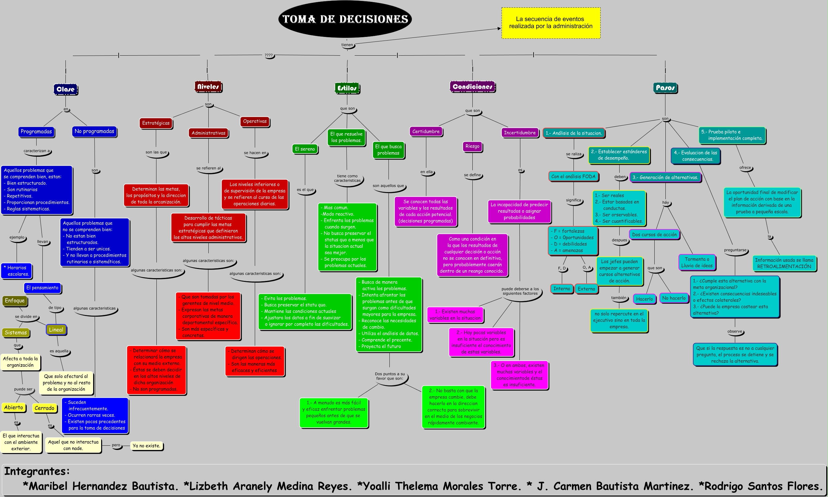 Este Cmap, tiene información relacionada con: Toma de Decisiones, Afecta a toda la organización puede ser Cerrado, Aquellos problemas que se comprenden bien, estan: - Bien estructurado. - Son rutinarios - Repetitivos. - Proporcionan procedimientos. - Reglas sistematicas. llevan El pensamiento, 3.- Generación de alternativas. háy Tormenta o Lluvia de ideas, Certidumbre en ella Se conocen todas las variables y los resultados de cada acción potencial. (decisiones programadas), 2.- Establecer estánderes de desempeño. deben 1.- Ser reales 2.- Estar basados en conductas. 3.- Ser orservables. 4.- Ser cuantificables., Abierto es El que interactua con el ambiente exterior., Condiciones que son Incertidumbre, El que resuelve los problemas. tiene como caracteristicas - Mas comun. -Modo reactivo. - Enfrenta los problemas cuando surgen. - No busca preservar el status quo a menos que la situacion actual sea mejor. - Se preocupa por los problemas actuales., Sistemas que Afecta a toda la organización, ???? ????, ???? Pasos, ???? Estilos, Incertidumbre es La incapacidad de predecir resultados o asignar probabilidades, Pasos son 3.- Generación de alternativas., ???? Clase, La oportunidad final de modificar el plan de acción con base en la información derivada de una prueba a pequeña escala. la Información usada se llama RETROALIMENTACIÓN, Estilos que son El que resuelve los problemas., Aquellos problemas que no se comprenden bien: - No estan bien estructurados. - Tienden a ser unicos. - Y no llevan a procedimientos rutinarios o sistemáticos. algunas caracteristicas - Suceden infrecuentemente. - Ocurren rarras veces. - Existen pocos precedentes para la toma de decisiones, Estilos que son El sereno, La incapacidad de predecir resultados o asignar probabilidades puede deberse a los siguientes factores 3.- O en ambos, existen muchas variables y el conocimientode éstas es insuficiente.