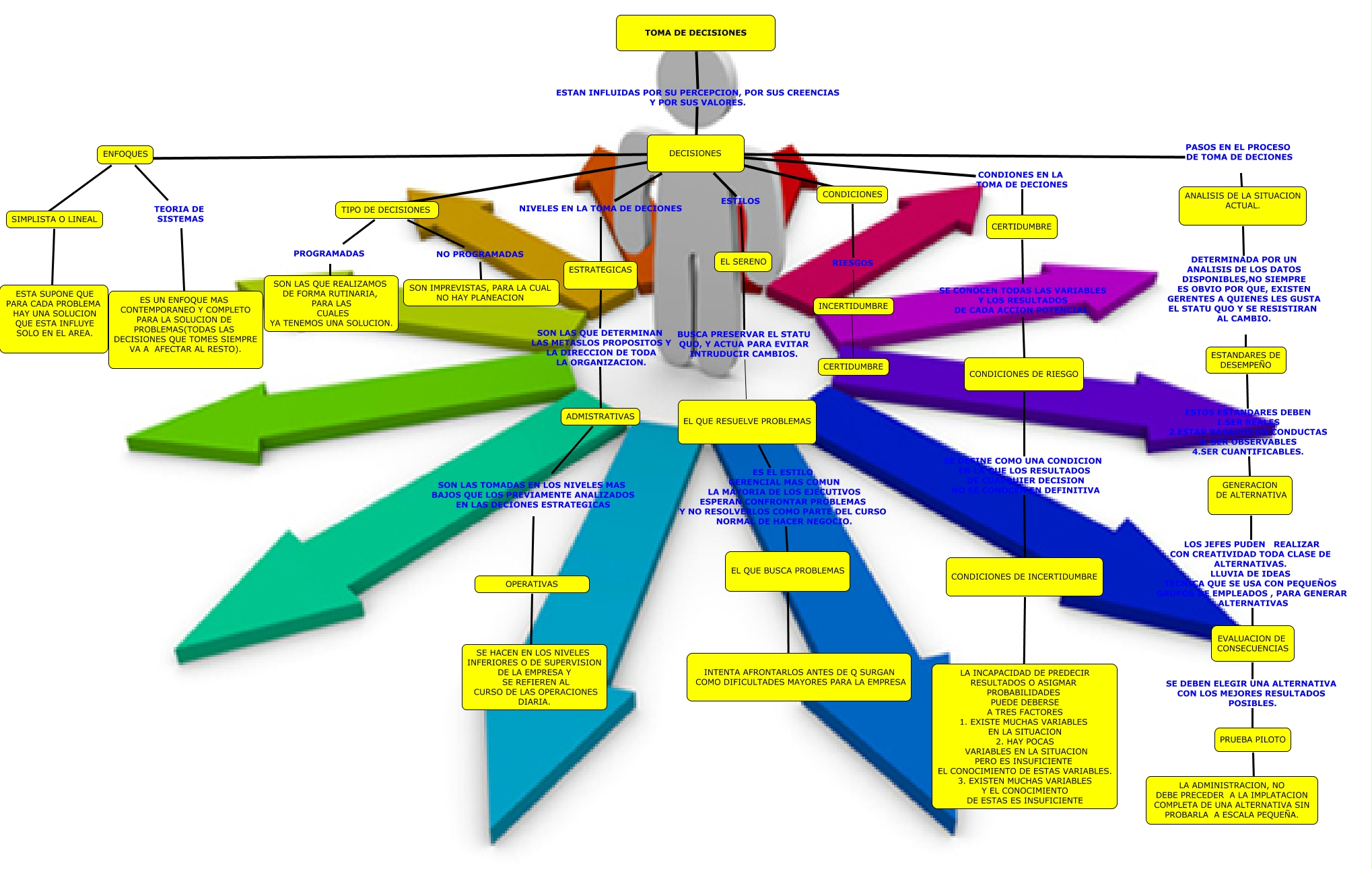 Este Cmap, tiene información relacionada con: TOMA DE .cmap, TIPO DE DECISIONES NO PROGRAMADAS SON IMPREVISTAS, PARA LA CUAL NO HAY PLANEACION, DECISIONES CONDIONES EN LA TOMA DE DECIONES CERTIDUMBRE, ENFOQUES ???? SIMPLISTA O LINEAL, ESTRATEGICAS SON LAS QUE DETERMINAN LAS METASLOS PROPOSITOS Y LA DIRECCION DE TODA LA ORGANIZACION. ADMISTRATIVAS, DECISIONES NIVELES EN LA TOMA DE DECIONES ESTRATEGICAS, CONDICIONES DE INCERTIDUMBRE ???? LA INCAPACIDAD DE PREDECIR RESULTADOS O ASIGMAR PROBABILIDADES PUEDE DEBERSE A TRES FACTORES 1. EXISTE MUCHAS VARIABLES EN LA SITUACION 2. HAY POCAS VARIABLES EN LA SITUACION PERO ES INSUFICIENTE EL CONOCIMIENTO DE ESTAS VARIABLES. 3. EXISTEN MUCHAS VARIABLES Y EL CONOCIMIENTO DE ESTAS ES INSUFICIENTE, DECISIONES ???? ENFOQUES, EL QUE RESUELVE PROBLEMAS ES EL ESTILO GERENCIAL MAS COMUN LA MAYORIA DE LOS EJECUTIVOS ESPERAN CONFRONTAR PROBLEMAS Y NO RESOLVERLOS COMO PARTE DEL CURSO NORMAL DE HACER NEGOCIO. EL QUE BUSCA PROBLEMAS, CONDICIONES DE RIESGO SE DEFINE COMO UNA CONDICION EN LA QUE LOS RESULTADOS DE CUALQUIER DECISION NO SE CONOCEN EN DEFINITIVA CONDICIONES DE INCERTIDUMBRE, SIMPLISTA O LINEAL ???? ????, TIPO DE DECISIONES PROGRAMADAS SON LAS QUE REALIZAMOS DE FORMA RUTINARIA, PARA LAS CUALES YA TENEMOS UNA SOLUCION., DECISIONES ESTILOS EL SERENO, ENFOQUES TEORIA DE SISTEMAS ES UN ENFOQUE MAS CONTEMPORANEO Y COMPLETO PARA LA SOLUCION DE PROBLEMAS(TODAS LAS DECISIONES QUE TOMES SIEMPRE VA A AFECTAR AL RESTO)., GENERACION DE ALTERNATIVA LOS JEFES PUDEN REALIZAR CON CREATIVIDAD TODA CLASE DE ALTERNATIVAS. LLUVIA DE IDEAS TECNICA QUE SE USA CON PEQUEÑOS GRUPOS DE EMPLEADOS , PARA GENERAR ALTERNATIVAS EVALUACION DE CONSECUENCIAS, EL QUE BUSCA PROBLEMAS ???? INTENTA AFRONTARLOS ANTES DE Q SURGAN COMO DIFICULTADES MAYORES PARA LA EMPRESA, DECISIONES ???? CONDICIONES, ANALISIS DE LA SITUACION ACTUAL. DETERMINADA POR UN ANALISIS DE LOS DATOS DISPONIBLES,NO SIEMPRE ES OBVIO POR QUE, EXISTEN GERENTES A QUIENES LES GUSTA EL STATU QUO Y SE RESISTIRAN AL CAMBIO. ESTANDARES DE DESEMPEÑO, EVALUACION DE CONSECUENCIAS SE DEBEN ELEGIR UNA ALTERNATIVA CON LOS MEJORES RESULTADOS POSIBLES. PRUEBA PILOTO, CONDICIONES RIESGOS INCERTIDUMBRE, CERTIDUMBRE SE CONOCEN TODAS LAS VARIABLES Y LOS RESULTADOS DE CADA ACCION POTENCIAL. CONDICIONES DE RIESGO