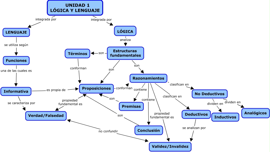 Este Cmap, tiene información relacionada con: Unidad 1, Proposiciones conforman Razonamientos, Razonamientos contiene Conclusión, Proposiciones propiedad fundamental es Verdad/Falsedad, Funciones una de las cuales es Informativa, No Deductivos dividen en Inductivos, Conclusión son Proposiciones, Estructuras fundamentales son Proposiciones, Razonamientos contiene Premisas, Razonamientos clasifican en Deductivos, LÓGICA analiza Estructuras fundamentales, Informativa se caracteriza por Verdad/Falsedad, Estructuras fundamentales son Razonamientos, Deductivos se analizan por Validez/Invalidez, Razonamientos clasifican en No Deductivos, Informativa es propia de Proposiciones, Premisas son Proposiciones, No Deductivos dividen en Analógicos, UNIDAD 1 LÓGICA Y LENGUAJE integrada por LENGUAJE, UNIDAD 1 LÓGICA Y LENGUAJE integrada por LÓGICA, Estructuras fundamentales son Términos