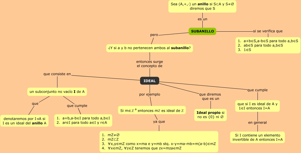 Este Cmap, tiene información relacionada con: Subanillo - ideales, un subconjunto no vacío I de A que denotaremos por I⊲A si I es un ideal del anillo A, SUBANILLO si se verifica que <math xmlns="http://www.w3.org/1998/Math/MathML"> <mrow> <mtext> 1. a+b∈S,a-b∈S para todo a,b∈S