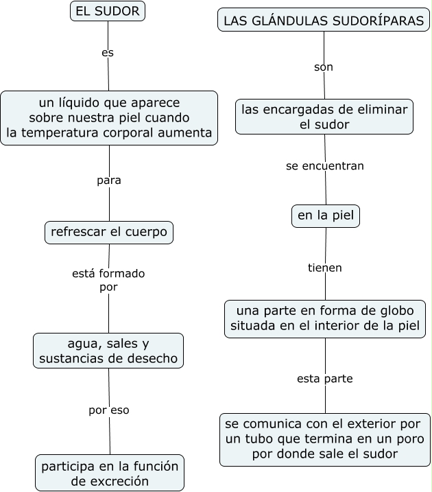 Este Cmap, tiene información relacionada con: El sudor y las glándulas sudoríparas, LAS GLÁNDULAS SUDORÍPARAS son las encargadas de eliminar el sudor, una parte en forma de globo situada en el interior de la piel esta parte se comunica con el exterior por un tubo que termina en un poro por donde sale el sudor, las encargadas de eliminar el sudor se encuentran en la piel, agua, sales y sustancias de desecho por eso participa en la función de excreción, un líquido que aparece sobre nuestra piel cuando la temperatura corporal aumenta para refrescar el cuerpo, refrescar el cuerpo está formado por agua, sales y sustancias de desecho, en la piel tienen una parte en forma de globo situada en el interior de la piel, EL SUDOR es un líquido que aparece sobre nuestra piel cuando la temperatura corporal aumenta