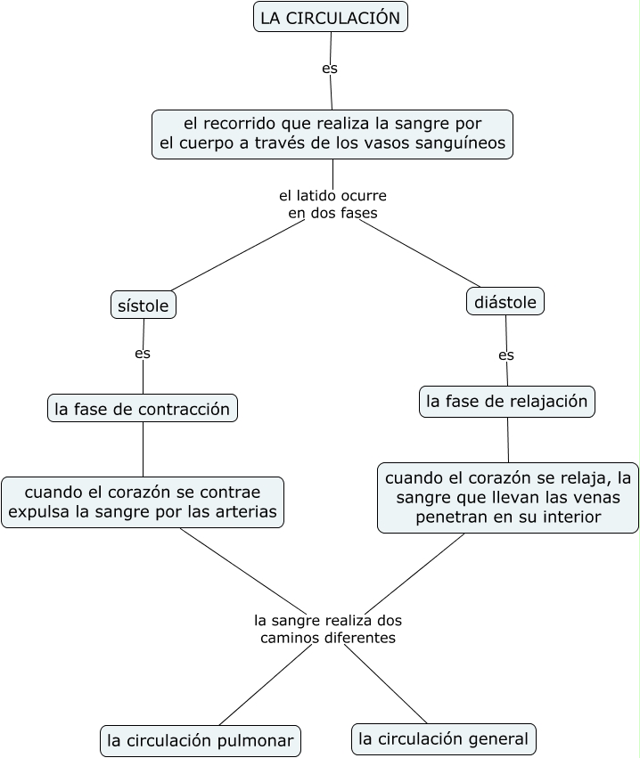 Este Cmap, tiene información relacionada con: La circulación, LA CIRCULACIÓN es el recorrido que realiza la sangre por el cuerpo a través de los vasos sanguíneos, cuando el corazón se relaja, la sangre que llevan las venas penetran en su interior la sangre realiza dos caminos diferentes la circulación general, el recorrido que realiza la sangre por el cuerpo a través de los vasos sanguíneos el latido ocurre en dos fases diástole, sístole es la fase de contracción, diástole es la fase de relajación, la fase de relajación cuando el corazón se relaja, la sangre que llevan las venas penetran en su interior, cuando el corazón se contrae expulsa la sangre por las arterias la sangre realiza dos caminos diferentes la circulación general, el recorrido que realiza la sangre por el cuerpo a través de los vasos sanguíneos el latido ocurre en dos fases sístole, cuando el corazón se contrae expulsa la sangre por las arterias la sangre realiza dos caminos diferentes la circulación pulmonar, la fase de contracción cuando el corazón se contrae expulsa la sangre por las arterias, cuando el corazón se relaja, la sangre que llevan las venas penetran en su interior la sangre realiza dos caminos diferentes la circulación pulmonar