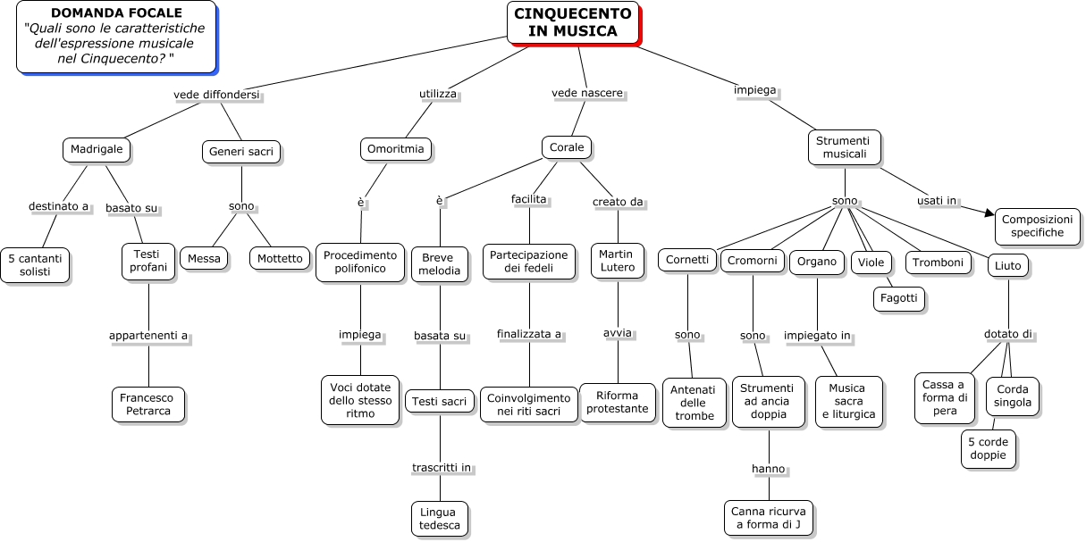 Questa Cmap, creata con IHMC CmapTools, contiene informazioni relative a: Cinquecento in Musica, CINQUECENTO IN MUSICA vede diffondersi Madrigale, Strumenti musicali sono Tromboni, Breve melodia basata su Testi sacri, Liuto dotato di Corda singola, Corale creato da Martin Lutero, Corale facilita Partecipazione dei fedeli, CINQUECENTO IN MUSICA vede nascere Corale, Generi sacri sono Mottetto, Strumenti musicali sono Viole, Strumenti musicali sono Fagotti, Strumenti musicali sono Liuto, Corale è Breve melodia, Strumenti musicali sono Organo, Testi profani appartenenti a Francesco Petrarca, Omoritmia è Procedimento polifonico, Strumenti ad ancia doppia hanno Canna ricurva a forma di J, Organo impiegato in Musica sacra e liturgica, Liuto dotato di 5 corde doppie, Madrigale basato su Testi profani, Madrigale destinato a 5 cantanti solisti