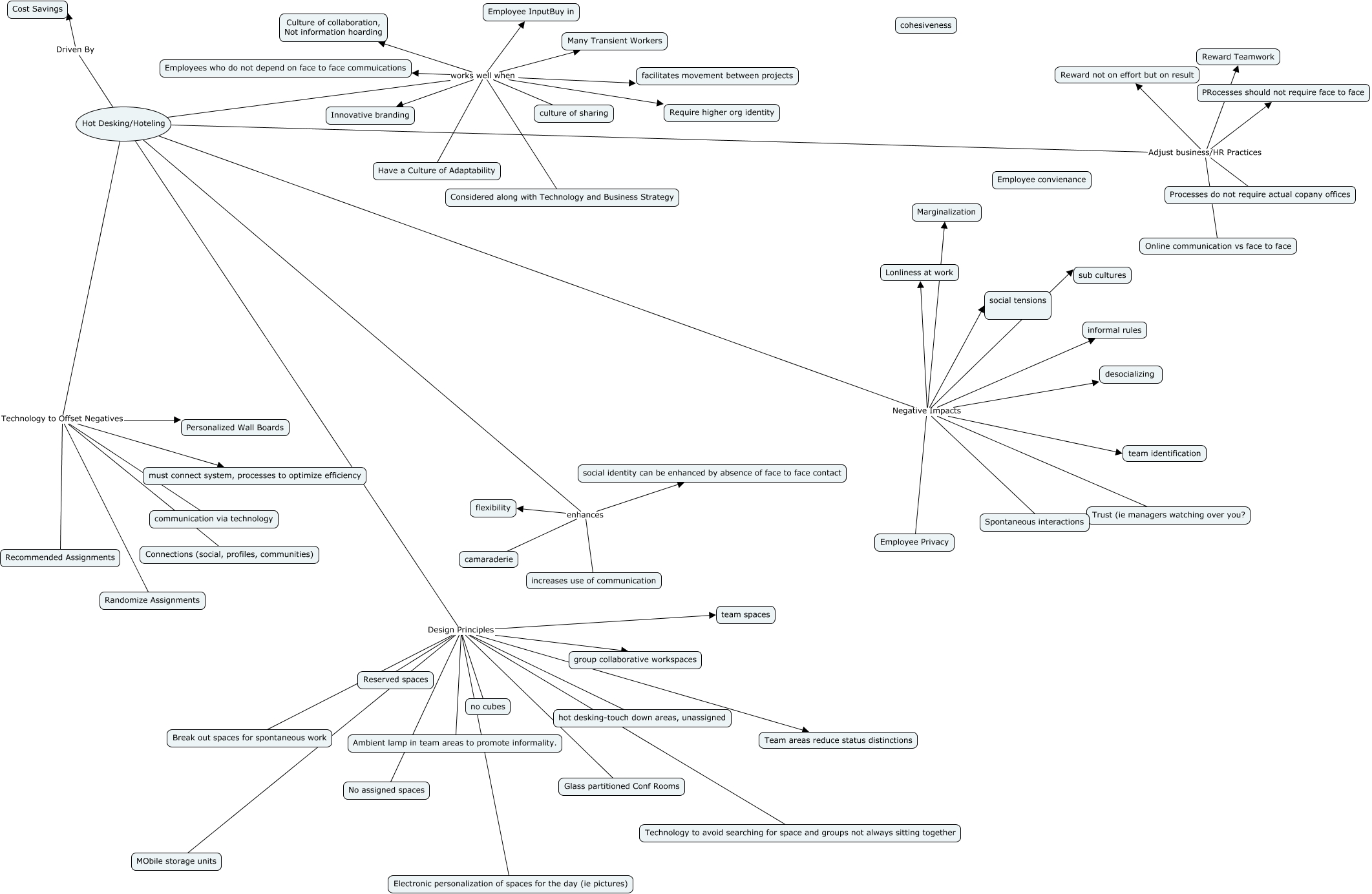 This Concept Map, created with IHMC CmapTools, has information related to: knowledge map foundations 2014 LL Design, Hot Desking/Hoteling works well when Employee InputBuy in, Hot Desking/Hoteling Technology to Offset Negatives must connect system, processes to optimize efficiency, Hot Desking/Hoteling Negative Impacts Marginalization, Hot Desking/Hoteling Design Principles no cubes, Hot Desking/Hoteling Driven By Cost Savings, Hot Desking/Hoteling Design Principles Ambient lamp in team areas to promote informality., Hot Desking/Hoteling Design Principles MObile storage units, Hot Desking/Hoteling Design Principles hot desking-touch down areas, unassigned, Hot Desking/Hoteling Design Principles group collaborative workspaces, Hot Desking/Hoteling works well when Many Transient Workers, Hot Desking/Hoteling Design Principles Break out spaces for spontaneous work, Hot Desking/Hoteling Adjust business/HR Practices PRocesses should not require face to face, Hot Desking/Hoteling works well when Have a Culture of Adaptability, Hot Desking/Hoteling Negative Impacts Spontaneous interactions, Hot Desking/Hoteling works well when facilitates movement between projects, Hot Desking/Hoteling Negative Impacts Trust (ie managers watching over you?, Hot Desking/Hoteling Adjust business/HR Practices Online communication vs face to face, Hot Desking/Hoteling works well when Considered along with Technology and Business Strategy, Hot Desking/Hoteling works well when Employees who do not depend on face to face commuications, Hot Desking/Hoteling Technology to Offset Negatives Personalized Wall Boards