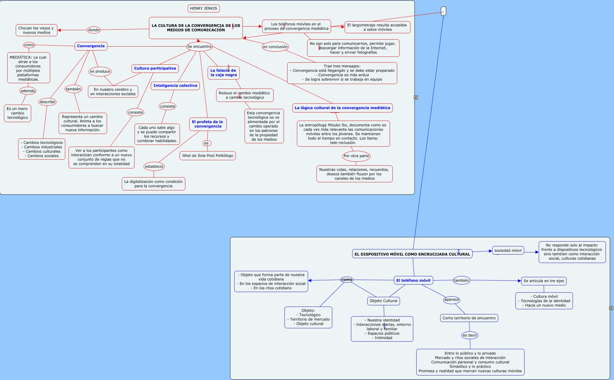 Este Cmap, tiene información relacionada con: CONVERGENCI Y DIVERGENCIA, El profeta de la convergencia Se encuentra LA CULTURA DE LA CONVERGENCIA DE LOS MEDIOS DE COMUNICACIÓN, El teléfono móvil como - Objeto que forma parte de nuestra vida cotidiana - En los espacios de interacción social - En los ritos cotidiano, Objeto Cultural - Nuestra identidad - Interacciones diarias, entorno laboral y familiar - Espacios públicos - Intimidad, Como territorio de encuentro es decir Entre lo público y lo privado Mercado y ritos sociales de interacción Comunicación personal y consumo cultural Simbólico y lo práctico Promesa y realidad que marcan nuevas culturas móviles, LA CULTURA DE LA CONVERGENCIA DE LOS MEDIOS DE COMUNICACIÓN donde Chocan los viejos y nuevos medios, La falacia de la caja negra Reduce el cambio mediático a cambio tecnológico, El teléfono móvil como Objeto: - Tecnológico - Territorio de mercado - Objeto cultural, Inteligencia colectiva consiste Cada uno sabe algo y se puede compartir los recursos y combinar habilidades., El profeta de la convergencia Se encuentra La lógica cultural de la convergencia mediática, Convergencia como MEDIÁTICA: La cual atrae a los consumidores por múltiples plataformas mediáticas., Reduce el cambio mediático a cambio tecnológico Esta convergencia tecnológica se ve alimentada por el cambio operado en los patrones de la propiedad de los medios, Los teléfonos móviles en el proceso de convergencia mediática No son solo para comunicarnos, permite jugar, descargar información de la Internet, hacer y enviar fotografías, MEDIÁTICA: La cual atrae a los consumidores por múltiples plataformas mediáticas. además Es un mero cambio tecnológico, sociedad móvil No responde solo al impacto frente a dispositivos tecnológicos sino tambíen como interacción social, culturas cotidianas, Inteligencia colectiva Se encuentra LA CULTURA DE LA CONVERGENCIA DE LOS MEDIOS DE COMUNICACIÓN, La falacia de la caja negra Se encuentra LA CULTURA DE LA CONVERGENCIA DE LOS MEDIOS DE COMUNICACIÓN, En nuestro cerebro y en interacciones sociales Se encuentra La lógica cultural de la convergencia mediática, El teléfono móvil también Se articula en tre ejes, El profeta de la convergencia estableció La digitalización como condición para la convergencia, Convergencia se produce En nuestro cerebro y en interacciones sociales