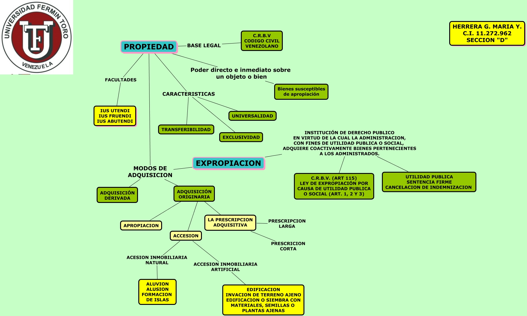 Este Cmap, tiene información relacionada con: PROPIEDAD Y EXPROPIACION, ACCESION ACCESION INMOBILIARIA ARTIFICIAL EDIFICACION INVACION DE TERRENO AJENO EDIFICACION O SIEMBRA CON MATERIALES, SEMILLAS O PLANTAS AJENAS, PROPIEDAD BASE LEGAL C.R.B.V CODIGO CIVIL VENEZOLANO, PROPIEDAD CARACTERISTICAS TRANSFERIBILIDAD, LA PRESCRIPCION ADQUISITIVA PRESCRICION CORTA, PROPIEDAD FACULTADES IUS UTENDI IUS FRUENDI IUS ABUTENDI, ADQUISICIÓN ORIGINARIA LA PRESCRIPCION ADQUISITIVA, LA PRESCRIPCION ADQUISITIVA PRESCRIPCION LARGA, EXPROPIACION INSTITUCIÓN DE DERECHO PUBLICO EN VIRTUD DE LA CUAL LA ADMINISTRACION, CON FINES DE UTILIDAD PUBLICA O SOCIAL, ADQUIERE COACTIVAMENTE BIENES PERTENECIENTES A LOS ADMINISTRADOS. C.R.B.V. (ART 115) LEY DE EXPROPIACIÓN POR CAUSA DE UTILIDAD PUBLICA O SOCIAL (ART. 1, 2 Y 3), PROPIEDAD MODOS DE ADQUISICION ADQUISICIÓN ORIGINARIA, PROPIEDAD MODOS DE ADQUISICION ADQUISICIÓN DERIVADA, ADQUISICIÓN ORIGINARIA ???? APROPIACION, PROPIEDAD CARACTERISTICAS EXCLUSIVIDAD, PROPIEDAD CARACTERISTICAS UNIVERSALIDAD, ACCESION ACESION INMOBILIARIA NATURAL ALUVION ALUSION FORMACION DE ISLAS, EXPROPIACION INSTITUCIÓN DE DERECHO PUBLICO EN VIRTUD DE LA CUAL LA ADMINISTRACION, CON FINES DE UTILIDAD PUBLICA O SOCIAL, ADQUIERE COACTIVAMENTE BIENES PERTENECIENTES A LOS ADMINISTRADOS. UTILIDAD PUBLICA SENTENCIA FIRME CANCELACION DE INDEMNIZACION, ADQUISICIÓN ORIGINARIA ACCESION, PROPIEDAD MODOS DE ADQUISICION EXPROPIACION, PROPIEDAD Poder directo e inmediato sobre un objeto o bien Bienes susceptibles de apropiación