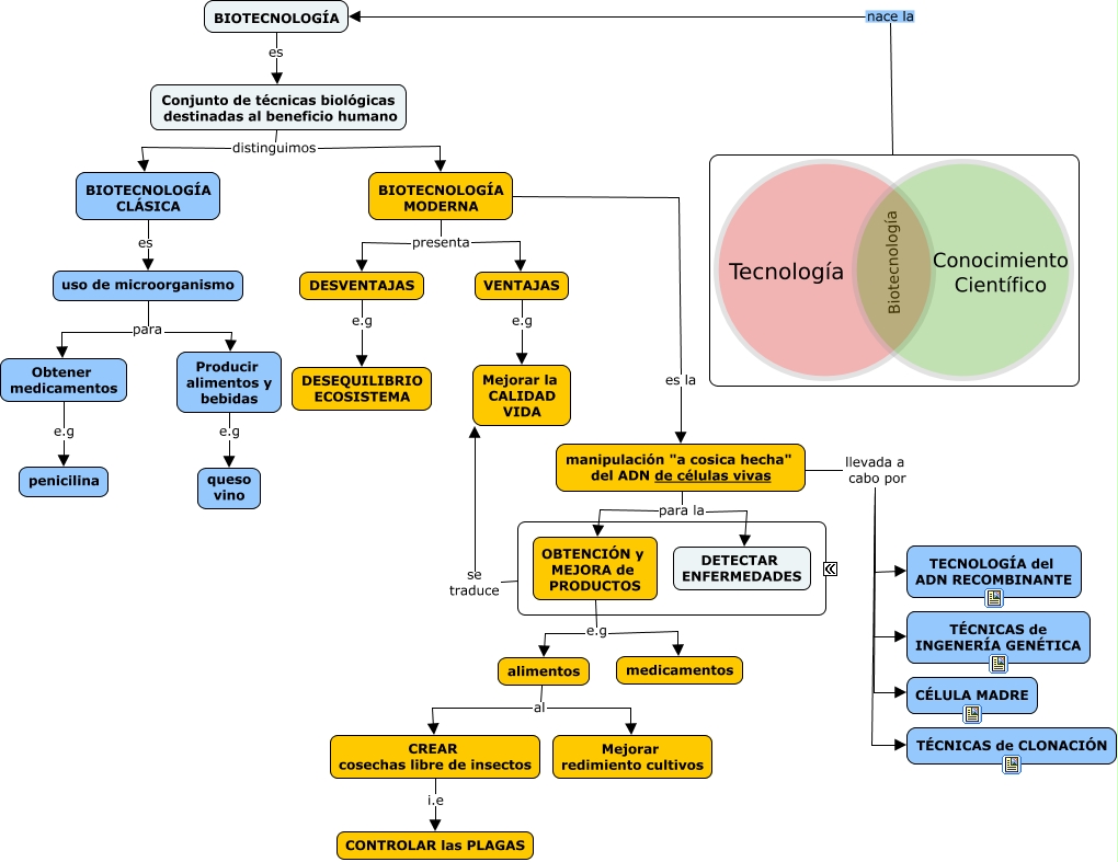 Este Cmap, tiene información relacionada con: 4.2 Biotecnología, manipulación "a cosica hecha" del ADN de células vivas para la OBTENCIÓN y MEJORA de PRODUCTOS, OBTENCIÓN y MEJORA de PRODUCTOS e.g medicamentos, Conjunto de técnicas biológicas destinadas al beneficio humano distinguimos BIOTECNOLOGÍA MODERNA, manipulación "a cosica hecha" del ADN de células vivas llevada a cabo por TECNOLOGÍA del ADN RECOMBINANTE, BIOTECNOLOGÍA CLÁSICA es uso de microorganismo, VENTAJAS e.g Mejorar la CALIDAD VIDA, DESVENTAJAS e.g DESEQUILIBRIO ECOSISTEMA, nace la BIOTECNOLOGÍA, manipulación "a cosica hecha" del ADN de células vivas llevada a cabo por TÉCNICAS de INGENERÍA GENÉTICA, Obtener medicamentos e.g penicilina, OBTENCIÓN y MEJORA de PRODUCTOS e.g alimentos, alimentos al Mejorar redimiento cultivos, uso de microorganismo para Producir alimentos y bebidas, uso de microorganismo para Obtener medicamentos, Conjunto de técnicas biológicas destinadas al beneficio humano distinguimos BIOTECNOLOGÍA CLÁSICA, Producir alimentos y bebidas e.g queso vino, BIOTECNOLOGÍA MODERNA presenta VENTAJAS, alimentos al CREAR cosechas libre de insectos, ???? se traduce Mejorar la CALIDAD VIDA, BIOTECNOLOGÍA MODERNA es la manipulación "a cosica hecha" del ADN de células vivas