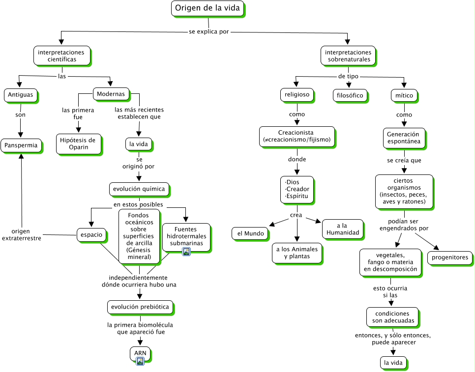 Este Cmap, tiene información relacionada con: 3.1 Origen de la vida, la vida se originó por evolución química, ciertos organismos (insectos, peces, aves y ratones) podían ser engendrados por progenitores, espacio origen extraterrestre Panspermia, interpretaciones sobrenaturales de tipo religioso, interpretaciones científicas las Antiguas, condiciones son adecuadas entonces, y sólo entonces, puede aparecer la vida, Fuentes hidrotermales submarinas independientemente dónde ocurriera hubo una evolución prebiótica, Origen de la vida se explica por interpretaciones científicas, interpretaciones científicas las Modernas, vegetales, fango o materia en descomposicón esto ocurria si las condiciones son adecuadas, ciertos organismos (insectos, peces, aves y ratones) podían ser engendrados por vegetales, fango o materia en descomposicón, evolución química en estos posibles escenarios Fondos oceánicos sobre superficies de arcilla (Génesis mineral), ·Dios ·Creador ·Espíritu crea a los Animales y plantas, Creacionista (≠creacionismo/fijismo) donde ·Dios ·Creador ·Espíritu, Fondos oceánicos sobre superficies de arcilla (Génesis mineral) independientemente dónde ocurriera hubo una evolución prebiótica, Modernas las más recientes establecen que la vida, mítico como Generación espontánea, espacio independientemente dónde ocurriera hubo una evolución prebiótica, interpretaciones sobrenaturales de tipo filosófico, ·Dios ·Creador ·Espíritu crea a la Humanidad