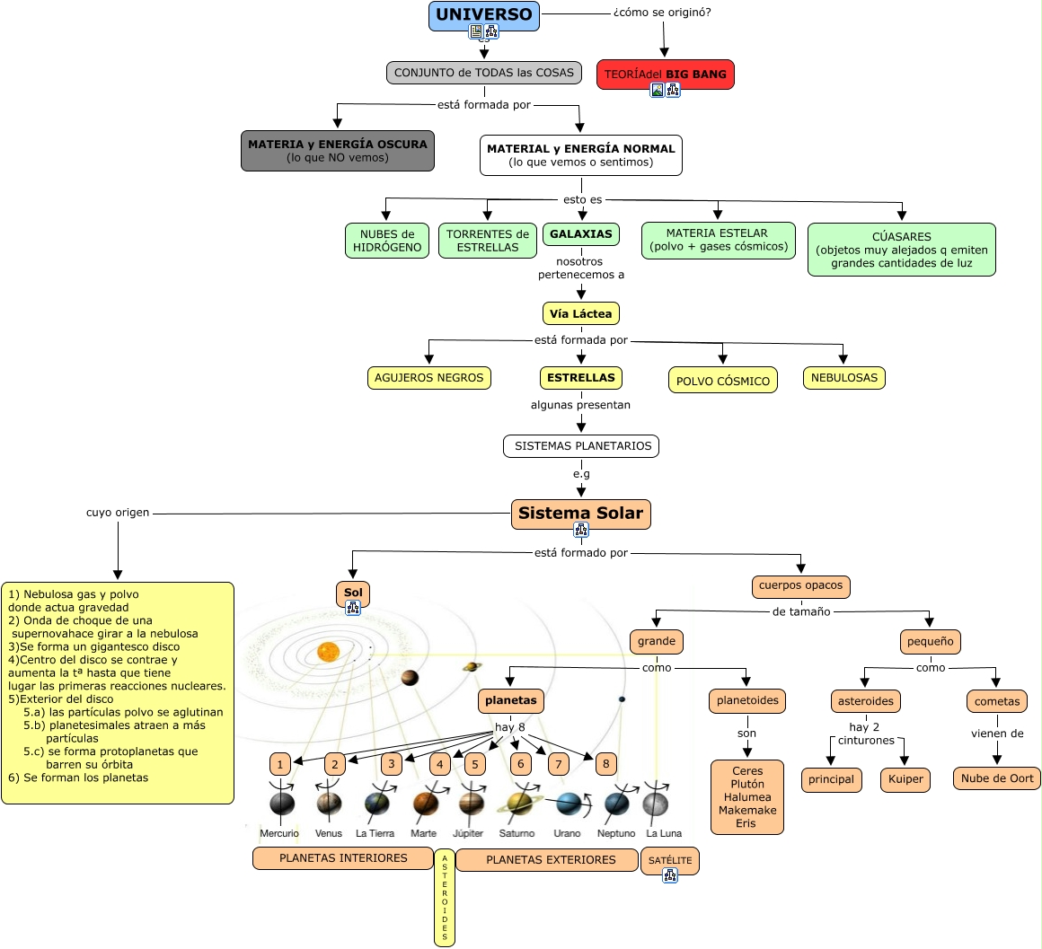 Este Cmap, tiene información relacionada con: EL ORIGEN DEL UNIVERSO. EL SISTEMA SOLAR, SISTEMAS PLANETARIOS e.g Sistema Solar, planetas hay 8 7, planetas hay 8 8, cuerpos opacos de tamaño grande, planetas hay 8 6, planetas hay 8 5, pequeño como asteroides, grande como planetas, cometas vienen de Nube de Oort, pequeño como cometas, Sistema Solar está formado por cuerpos opacos, asteroides hay 2 cinturones principal, UNIVERSO ¿cómo se originó? TEORÍAdel BIG BANG, Vía Láctea está formada por AGUJEROS NEGROS, Vía Láctea está formada por POLVO CÓSMICO, MATERIAL y ENERGÍA NORMAL (lo que vemos o sentimos) esto es TORRENTES de ESTRELLAS, MATERIAL y ENERGÍA NORMAL (lo que vemos o sentimos) esto es GALAXIAS, planetas hay 8 1, Vía Láctea está formada por NEBULOSAS, planetas hay 8 2