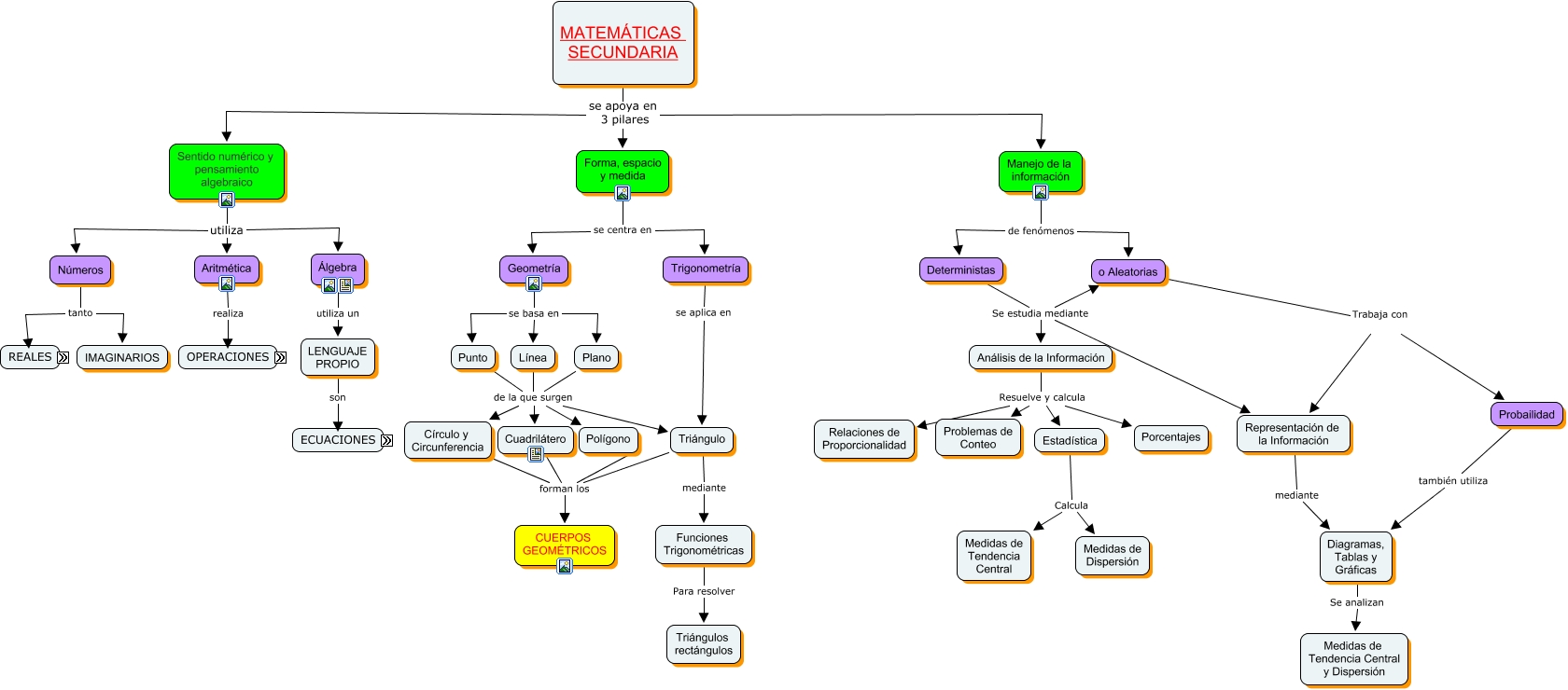 Este Cmap, tiene información relacionada con: Qué se estudia en secundaria, Fraccionarios distinguimos Comunes, Forma, espacio y medida se centra en Trigonometría, MATEMÁTICAS SECUNDARIA se apoya en 3 pilares Sentido numérico y pensamiento algebraico, Deterministas Se estudia mediante Análisis de la Información, Racionales i.e Enteros, ECUACIONES distinguimos Ecuaciomes de 1er. grado, Línea de la que surgen Círculo y Circunferencia, Aritmética realiza Operaciones, Operaciones son Potenciación, Punto de la que surgen Triángulo, Racionales i.e Fraccionarios, Naturales Ejémplos 0,1,2,3,4..., Geometría se basa en Punto, Comunes Se clasifican en: Impropias, Geometría se basa en Línea, Funciones Trigonométricas Para resolver Triángulos rectángulos, LENGUAJE PROPIO son ECUACIONES, Impropias Ej. 3/3,5/2..., Ecuaciomes de 1er. grado donde aparece Polinomios, Números tanto IMAGINARIOS