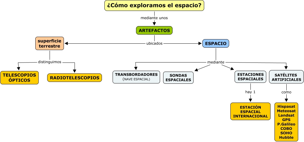 Este Cmap, tiene información relacionada con: 9 Exploración del Universo, ESTACIONES ESPACIALES hay 1 ESTACIÓN ESPACIAL INTERNACIONAL, SATÉLITES ARTIFICIALES como Hispasat Meteosat Landsat GPS P.Galileo COBO SOHO Hubble, ESPACIO mediante ESTACIONES ESPACIALES, ¿Cómo exploramos el espacio? mediante unos ARTEFACTOS, superficie terrestre distinguimos RADIOTELESCOPIOS, ESPACIO mediante SATÉLITES ARTIFICIALES, ESPACIO mediante TRANSBORDADORES (NAVE ESPACIAL), ARTEFACTOS ubicados superficie terrestre, superficie terrestre distinguimos TELESCOPIOS ÓPTICOS, ARTEFACTOS ubicados ESPACIO, ESPACIO mediante SONDAS ESPACIALES