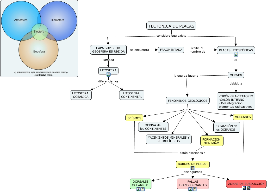Este Cmap, tiene información relacionada con: 2.3 Tectónica de placas, la superficie cambiante, FENÓMENOS GEOLÓGICOS como DERIVA de los CONTINENTES, CAPA SUPERIOR GEOSFERA ES RÍGIDA llamada LITOSFERA, MUEVEN debido a ·TIRÓN GRAVITATORIO ·CALOR INTERNO · Desintegración elementos radioactivos, VOLCANES están asociados a BORDES DE PLACAS, SEÍSMOS están asociados a BORDES DE PLACAS, PLACAS LITOSFÉRICAS se MUEVEN, FENÓMENOS GEOLÓGICOS como EXPANSIÓN de los OCÉANOS, CAPA SUPERIOR GEOSFERA ES RÍGIDA se encuentra FRAGMENTADA, FENÓMENOS GEOLÓGICOS como FORMACIÓN MONTAÑAS, TECTÓNICA DE PLACAS considera que existe PLACAS LITOSFÉRICAS, LITOSFERA diferenciamos LITOSFERA OCEÁNICA, FRAGMENTADA recibe el nombre de PLACAS LITOSFÉRICAS, BORDES DE PLACAS distinguimos FALLAS TRANSFORMANTES, MUEVEN lo que da lugar a FENÓMENOS GEOLÓGICOS, BORDES DE PLACAS distinguimos ZONAS DE SUBDUCCIÓN, FENÓMENOS GEOLÓGICOS como VOLCANES, FENÓMENOS GEOLÓGICOS como SEÍSMOS, FENÓMENOS GEOLÓGICOS como YACIMIENTOS MINERALES Y PETROLÍFEROS, FORMACIÓN MONTAÑAS están asociados a BORDES DE PLACAS, TECTÓNICA DE PLACAS considera que existe CAPA SUPERIOR GEOSFERA ES RÍGIDA
