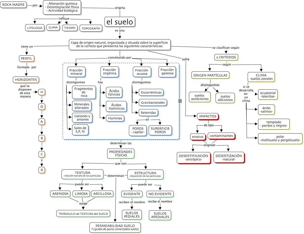 Este Cmap, tiene información relacionada con: Tema 17, ESTRUCTURA -disposición de las partículas- determinan PERMEABILIDAD SUELO f (grado de poros conectados suelo), Fracción orgánica hay Ácidos fúlvicos, ???? determinan las PROPIEDADES FÍSICAS, PROPIEDADES FÍSICAS que son ESTRUCTURA -disposición de las partículas-, erosivo originan DESERTIZACIÓN -natural-, CLIMA -suelos zonales si se desarrolla en un clima polar -mollisuelo y pergelisuelo-, erosivo originan DESERTIFICACIÓN -antrópico-, TEXTURA -relación tamaño de las partículas- puede ser ARENOSA, ARCILLOSA surge TRIÁNGULO de TEXTURA del SUELO, - Alteración química - Desintegración física - Actividad biológica inflluye TOPOGRAFÍA, Capa de origen natural, organizada y situada sobre la superficie de la corteza que peresenta las siguientes características: constitutido por Fracción acuosa, ESTRUCTURA -disposición de las partículas- puede ser EVIDENTE, contaminantes originan DESERTIFICACIÓN -antrópico-, 2 CRITERIOS según ORIGEN PARTÍCULAS, - Alteración química - Desintegración física - Actividad biológica inflluye CLIMA, C y R, CLIMA -suelos zonales si se desarrolla en un clima ecuatorial -lateritas-, H , O, NO EVIDENTE recibe el nombre SUELOS APEDIALES, Retenidas en POROS - capilar-
