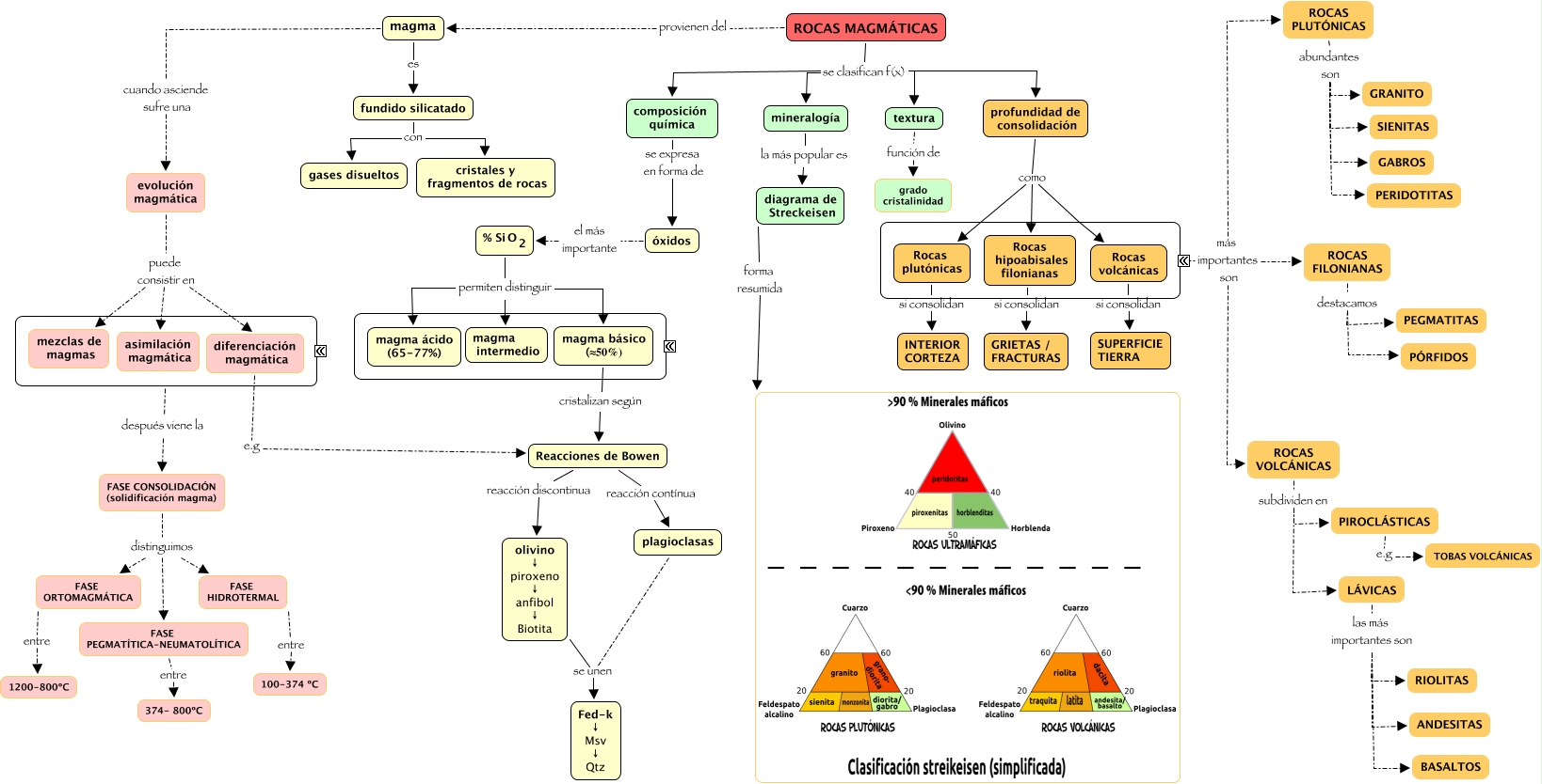 Este Cmap, tiene información relacionada con: Tema 04, ROCAS PLUTÓNICAS abundantes son SIENITAS, olivino ↓ piroxeno ↓ anfibol ↓ Biotita se unen Fed-k ↓ Msv ↓ Qtz, ROCAS MAGMÁTICAS se clasifican f(x) composición química, diferenciación magmática e.g Reacciones de Bowen, Rocas volcánicas si consolidan SUPERFICIE TIERRA, óxidos el más importante <math xmlns="http://www.w3.org/1998/Math/MathML"> <mrow> <mtext> % Si </mtext> <mmultiscripts> <mtext> O </mtext> <mtext> 2 </mtext> <none/> </mmultiscripts> </mrow> </math>, ROCAS MAGMÁTICAS se clasifican f(x) mineralogía, <math xmlns="http://www.w3.org/1998/Math/MathML"> <mrow> <mtext> % Si </mtext> <mmultiscripts> <mtext> O </mtext> <mtext> 2 </mtext> <none/> </mmultiscripts> </mrow> </math> permiten distinguir magma intermedio, FASE ORTOMAGMÁTICA entre 1200-800ºC, profundidad de consolidación como Rocas plutónicas, LÁVICAS las más importantes son BASALTOS, evolución magmática puede consistir en diferenciación magmática, ROCAS VOLCÁNICAS subdividen en PIROCLÁSTICAS, ROCAS MAGMÁTICAS se clasifican f(x) profundidad de consolidación, ROCAS FILONIANAS destacamos PÓRFIDOS, diagrama de Streckeisen forma resumida, evolución magmática puede consistir en mezclas de magmas, <math xmlns="http://www.w3.org/1998/Math/MathML"> <mrow> <mtext> % Si </mtext> <mmultiscripts> <mtext> O </mtext> <mtext> 2 </mtext> <none/> </mmultiscripts> </mrow> </math> permiten distinguir magma básico (≈50%), plagioclasas se unen Fed-k ↓ Msv ↓ Qtz, FASE CONSOLIDACIÓN (solidificación magma) distinguimos FASE ORTOMAGMÁTICA
