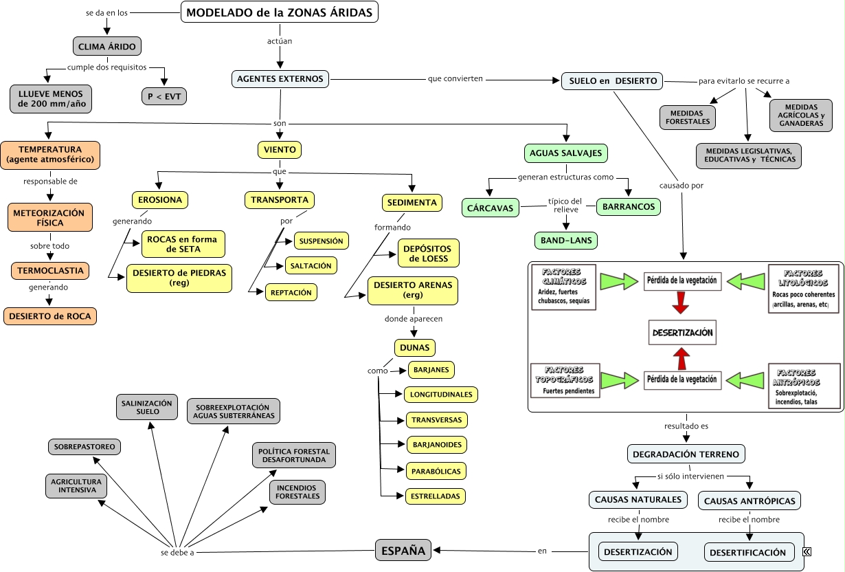 Este Cmap, tiene información relacionada con: Tema 15, ESPAÑA se debe a POLÍTICA FORESTAL DESAFORTUNADA, DUNAS como LONGITUDINALES, AGENTES EXTERNOS son AGUAS SALVAJES, VIENTO que SEDIMENTA, ???? en ESPAÑA, DEGRADACIÓN TERRENO si sólo intervienen CAUSAS NATURALES, DUNAS como TRANSVERSAS, DUNAS como BARJANOIDES, CAUSAS ANTRÓPICAS recibe el nombre DESERTIFICACIÓN, SUELO en DESIERTO para evitarlo se recurre a MEDIDAS FORESTALES, AGENTES EXTERNOS son TEMPERATURA (agente atmosférico), resultado es DEGRADACIÓN TERRENO, DUNAS como ESTRELLADAS, ESPAÑA se debe a SALINIZACIÓN SUELO, CLIMA ÁRIDO cumple dos requisitos LLUEVE MENOS de 200 mm/año, EROSIONA generando DESIERTO de PIEDRAS (reg), MODELADO de la ZONAS ÁRIDAS se da en los CLIMA ÁRIDO, MODELADO de la ZONAS ÁRIDAS actúan AGENTES EXTERNOS, AGUAS SALVAJES generan estructuras como BARRANCOS, TRANSPORTA por REPTACIÓN