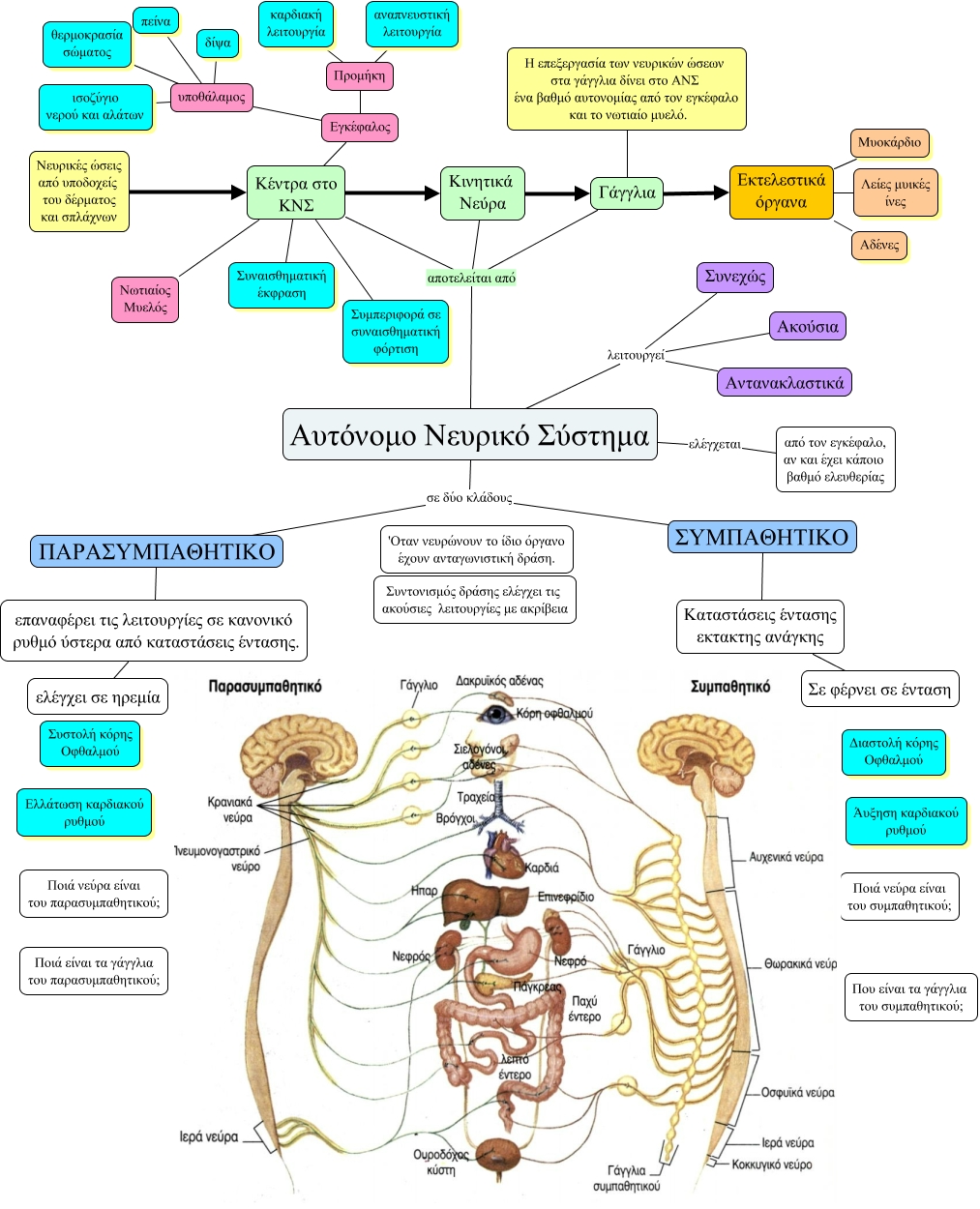 Αυτός ο εννοιολογικός χάρτης, που δημιουργήθηκε με το IHMC Cmap Tools, περιέχει πλήροφορίες που σχετίζονται με: Autonomo_NEURIKO_Systhma, Εγκέφαλος Προμήκη, υποθάλαμος πείνα, Η επεξεργασία των νευρικών ώσεων στα γάγγλια δίνει στο ΑΝΣ ένα βαθμό αυτονομίας από τον εγκέφαλο και το νωτιαίο μυελό. Γάγγλια, υποθάλαμος ισοζύγιο νερού και αλάτων, Αυτόνομο Νευρικό Σύστημα λειτουργεί Συνεχώς, Κέντρα στο ΚΝΣ Συμπεριφορά σε συναισθηματική φόρτιση, Αυτόνομο Νευρικό Σύστημα αποτελείται από Γάγγλια, ΣΥΜΠΑΘΗΤΙΚΟ Καταστάσεις έντασης εκτακτης ανάγκης, ΠΑΡΑΣΥΜΠΑΘΗΤΙΚΟ επαναφέρει τις λειτουργίες σε κανονικό ρυθμό ύστερα από καταστάσεις έντασης., Εγκέφαλος υποθάλαμος, Κινητικά Νεύρα Γάγγλια, υποθάλαμος θερμοκρασία σώματος, Αυτόνομο Νευρικό Σύστημα σε δύο κλάδους ΠΑΡΑΣΥΜΠΑΘΗΤΙΚΟ, Νευρικές ώσεις από υποδοχείς του δέρματος και σπλάχνων Κέντρα στο ΚΝΣ, Αυτόνομο Νευρικό Σύστημα λειτουργεί Αντανακλαστικά, Αυτόνομο Νευρικό Σύστημα λειτουργεί Ακούσια, Κέντρα στο ΚΝΣ Νωτιαίος Μυελός, Εκτελεστικά όργανα Μυοκάρδιο, υποθάλαμος δίψα, Αυτόνομο Νευρικό Σύστημα αποτελείται από Κέντρα στο ΚΝΣ