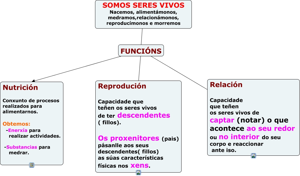 Este Cmap, tiene información relacionada con: funcions vitais, FUNCIÓNS Nutrición Conxunto de procesos realizados para alimentarnos. Obtemos: -Enerxía para realizar actividades. -Substancias para medrar., FUNCIÓNS Reprodución Capacidade que teñen os seres vivos de ter descendentes ( fillos). Os proxenitores (pais) pásanlle aos seus descendentes( fillos) as súas características físicas nos xens., FUNCIÓNS Relación Capacidade que teñen os seres vivos de captar (notar) o que acontece ao seu redor ou no interior do seu corpo e reaccionar ante iso., SOMOS SERES VIVOS Nacemos, alimentámonos, medramos,relacionámonos, reproducímonos e morremos FUNCIÓNS