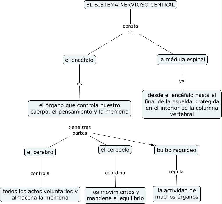 Este Cmap, tiene información relacionada con: El sistema nervioso central, el cerebro controla todos los actos voluntarios y almacena la memoria, bulbo raquídeo regula la actividad de muchos órganos, el encéfalo es el órgano que controla nuestro cuerpo, el pensamiento y la memoria, el órgano que controla nuestro cuerpo, el pensamiento y la memoria tiene tres partes bulbo raquídeo, la médula espinal va desde el encéfalo hasta el final de la espalda protegida en el interior de la columna vertebral, EL SISTEMA NERVIOSO CENTRAL consta de la médula espinal, EL SISTEMA NERVIOSO CENTRAL consta de el encéfalo, el cerebelo coordina los movimientos y mantiene el equilibrio, el órgano que controla nuestro cuerpo, el pensamiento y la memoria tiene tres partes el cerebro, el órgano que controla nuestro cuerpo, el pensamiento y la memoria tiene tres partes el cerebelo