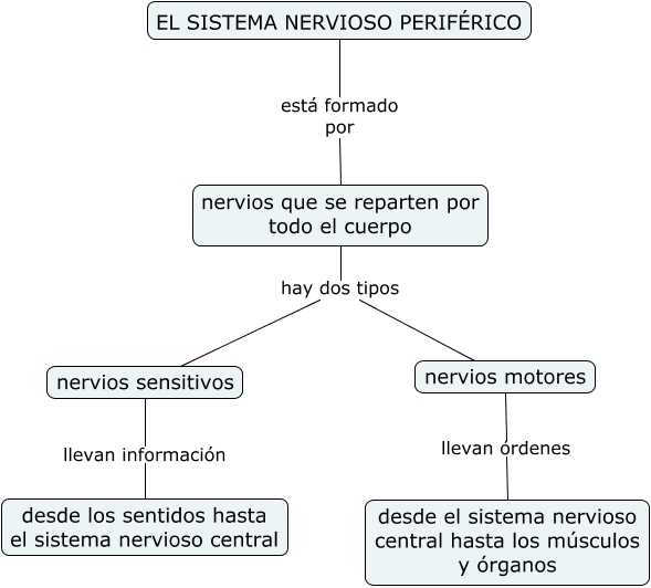 Este Cmap, tiene información relacionada con: El sistema nervioso periférico, nervios que se reparten por todo el cuerpo hay dos tipos nervios motores, nervios sensitivos llevan información desde los sentidos hasta el sistema nervioso central, nervios que se reparten por todo el cuerpo hay dos tipos nervios sensitivos, nervios motores llevan órdenes desde el sistema nervioso central hasta los músculos y órganos, EL SISTEMA NERVIOSO PERIFÉRICO está formado por nervios que se reparten por todo el cuerpo