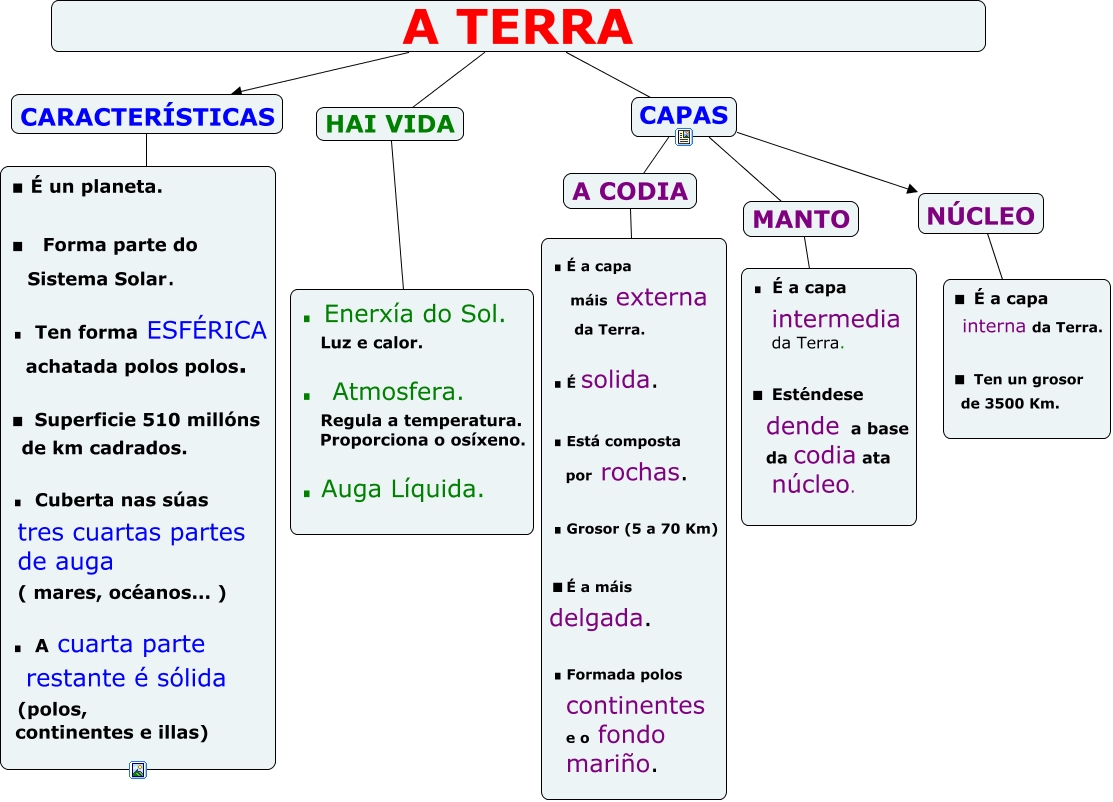 Este Cmap, tiene información relacionada con: A TERRA1, A CODIA .É a capa máis externa da Terra. .É solida. .Está composta por rochas. .Grosor (5 a 70 Km) .É a máis delgada. .Formada polos continentes e o fondo mariño., A TERRA CARACTERÍSTICAS, HAI VIDA . Enerxía do Sol. Luz e calor. . Atmosfera. Regula a temperatura. Proporciona o osíxeno. . Auga Líquida., NÚCLEO . É a capa interna da Terra. . Ten un grosor de 3500 Km., A TERRA CAPAS, CAPAS NÚCLEO, CAPAS MANTO, CAPAS A CODIA, CARACTERÍSTICAS . É un planeta. . Forma parte do Sistema Solar. . Ten forma ESFÉRICA achatada polos polos. . Superficie 510 millóns de km cadrados. . Cuberta nas súas tres cuartas partes de auga ( mares, océanos... ) . A cuarta parte restante é sólida (polos, continentes e illas), A TERRA HAI VIDA, MANTO . É a capa intermedia da Terra. . Esténdese dende a base da codia ata núcleo.