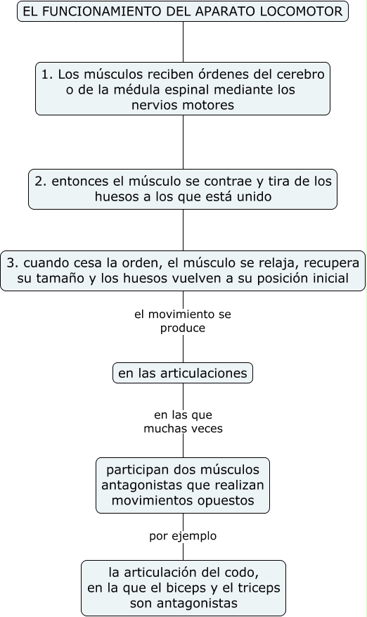 Este Cmap, tiene información relacionada con: El funcionamiento del aparato locomotor, participan dos músculos antagonistas que realizan movimientos opuestos por ejemplo la articulación del codo, en la que el biceps y el triceps son antagonistas, 1. Los músculos reciben órdenes del cerebro o de la médula espinal mediante los nervios motores 2. entonces el músculo se contrae y tira de los huesos a los que está unido, en las articulaciones en las que muchas veces participan dos músculos antagonistas que realizan movimientos opuestos, EL FUNCIONAMIENTO DEL APARATO LOCOMOTOR 1. Los músculos reciben órdenes del cerebro o de la médula espinal mediante los nervios motores, 3. cuando cesa la orden, el músculo se relaja, recupera su tamaño y los huesos vuelven a su posición inicial el movimiento se produce en las articulaciones, 2. entonces el músculo se contrae y tira de los huesos a los que está unido 3. cuando cesa la orden, el músculo se relaja, recupera su tamaño y los huesos vuelven a su posición inicial