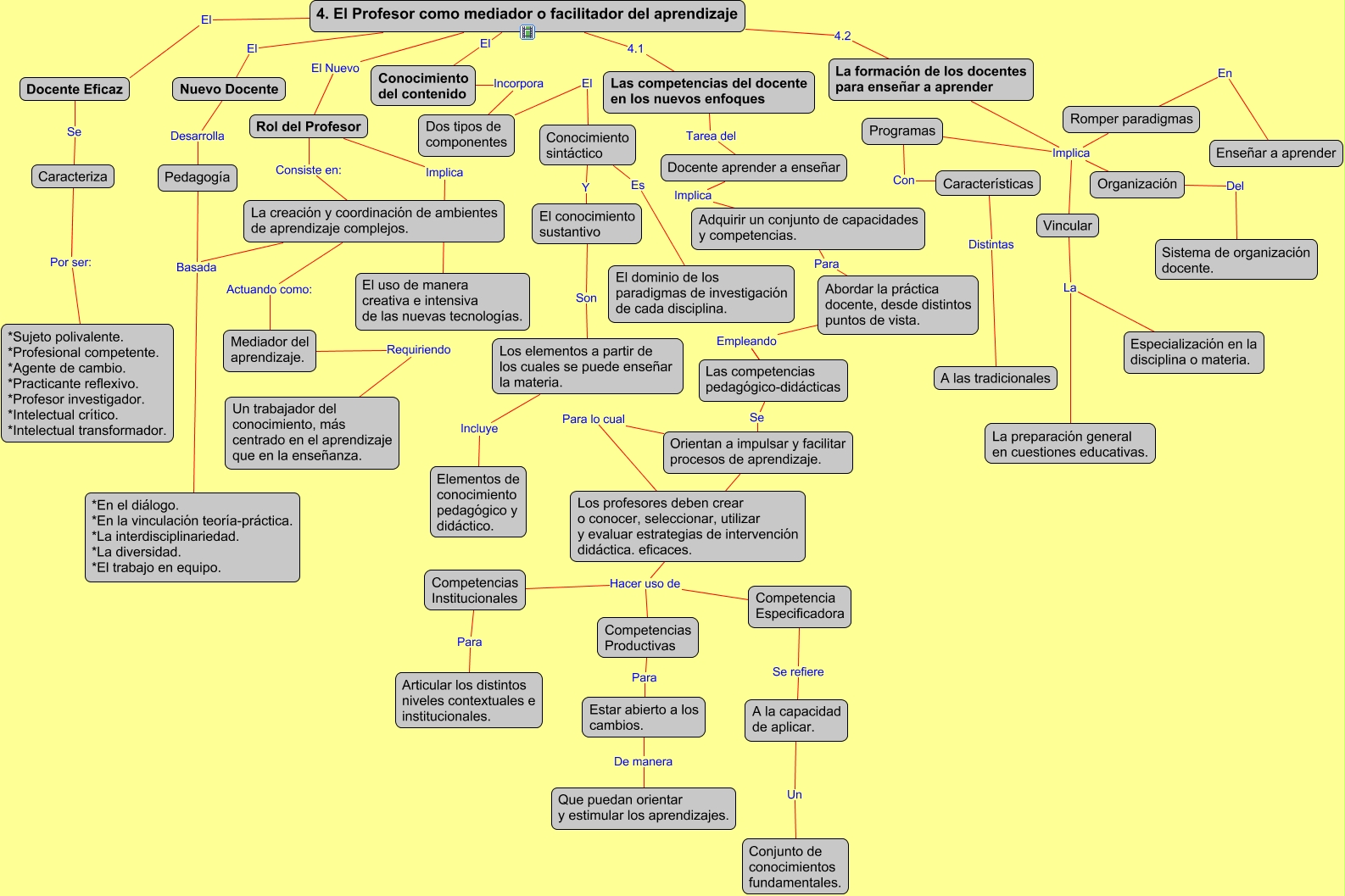 Este Cmap, tiene información relacionada con: Sin Título, Vincular La La preparación general en cuestiones educativas., Programas Con Características, Dos tipos de componentes El Conocimiento sintáctico, 4. El Profesor como mediador o facilitador del aprendizaje El Conocimiento del contenido, Competencias Productivas Para Estar abierto a los cambios., Orientan a impulsar y facilitar procesos de aprendizaje. Hacer uso de Competencias Productivas, Orientan a impulsar y facilitar procesos de aprendizaje. Hacer uso de Competencias Institucionales, Rol del Profesor Implica El uso de manera creativa e intensiva de las nuevas tecnologías., Rol del Profesor Consiste en: La creación y coordinación de ambientes de aprendizaje complejos., Nuevo Docente Desarrolla Pedagogía, Organización Del Sistema de organización docente., La formación de los docentes para enseñar a aprender Implica Programas, Competencia Especificadora Se refiere A la capacidad de aplicar., 4. El Profesor como mediador o facilitador del aprendizaje 4.1 Las competencias del docente en los nuevos enfoques, La formación de los docentes para enseñar a aprender Implica Organización, Abordar la práctica docente, desde distintos puntos de vista. Empleando Las competencias pedagógico-didácticas, Orientan a impulsar y facilitar procesos de aprendizaje. Hacer uso de Competencia Especificadora, La creación y coordinación de ambientes de aprendizaje complejos. Actuando como: Mediador del aprendizaje., Romper paradigmas En Enseñar a aprender, Caracteriza Por ser: *Sujeto polivalente. *Profesional competente. *Agente de cambio. *Practicante reflexivo. *Profesor investigador. *Intelectual crítico. *Intelectual transformador.