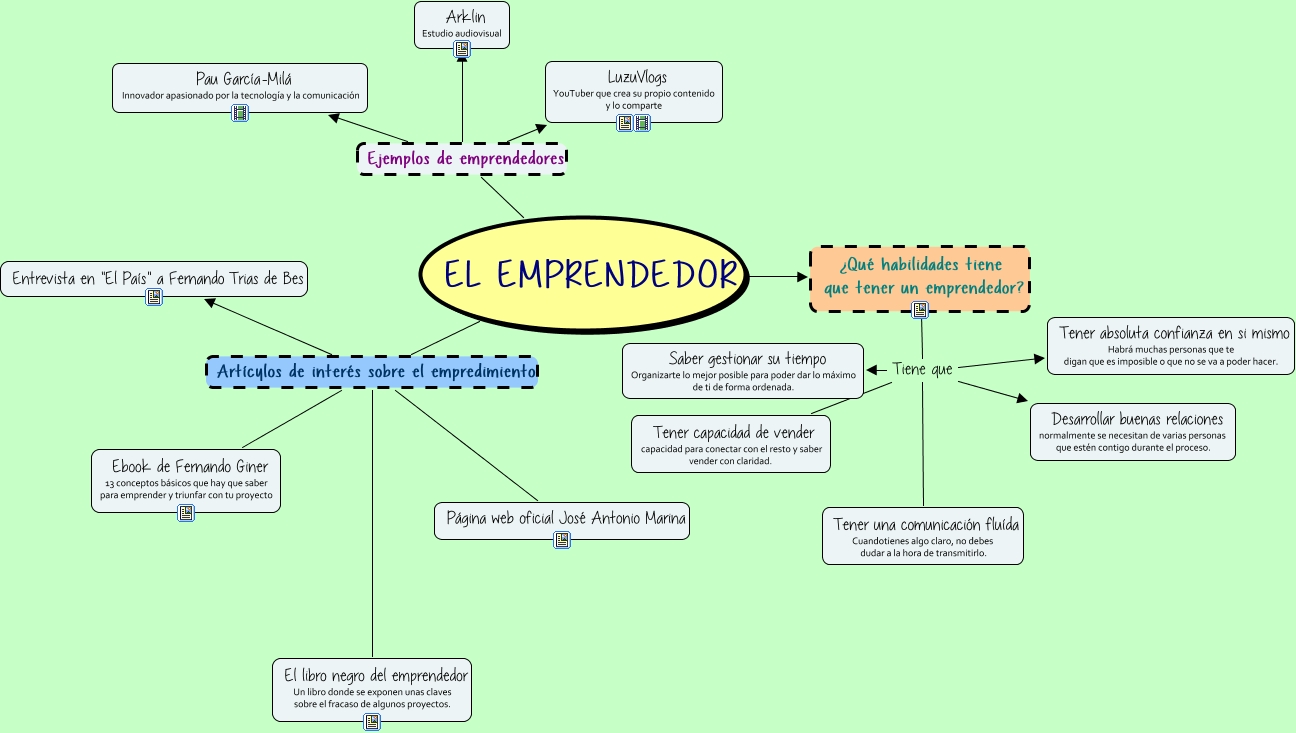Este Cmap, tiene información relacionada con: RETO - EL EMPRENDEDOR, EL EMPRENDEDOR Artícylos de interés sobre el empredimiento El libro negro del emprendedor Un libro donde se exponen unas claves sobre el fracaso de algunos proyectos., ¿Qué habilidades tiene que tener un emprendedor? Tiene que Saber gestionar su tiempo Organizarte lo mejor posible para poder dar lo máximo de ti de forma ordenada., ¿Qué habilidades tiene que tener un emprendedor? Tiene que Tener capacidad de vender capacidad para conectar con el resto y saber vender con claridad., EL EMPRENDEDOR Artícylos de interés sobre el empredimiento Entrevista en "El País" a Fernando Trias de Bes, ¿Qué habilidades tiene que tener un emprendedor? Tiene que Desarrollar buenas relaciones normalmente se necesitan de varias personas que estén contigo durante el proceso., EL EMPRENDEDOR Ejemplos de emprendedores Arklin Estudio audiovisual, ¿Qué habilidades tiene que tener un emprendedor? Tiene que Tener absoluta confianza en si mismo Habrá muchas personas que te digan que es imposible o que no se va a poder hacer., EL EMPRENDEDOR Ejemplos de emprendedores Pau García-Milá Innovador apasionado por la tecnología y la comunicación, EL EMPRENDEDOR Artícylos de interés sobre el empredimiento Ebook de Fernando Giner 13 conceptos básicos que hay que saber para emprender y triunfar con tu proyecto, EL EMPRENDEDOR Ejemplos de emprendedores LuzuVlogs YouTuber que crea su propio contenido y lo comparte, EL EMPRENDEDOR Artícylos de interés sobre el empredimiento Página web oficial José Antonio Marina, EL EMPRENDEDOR ???? ¿Qué habilidades tiene que tener un emprendedor?, ¿Qué habilidades tiene que tener un emprendedor? Tiene que Tener una comunicación fluída Cuandotienes algo claro, no debes dudar a la hora de transmitirlo.