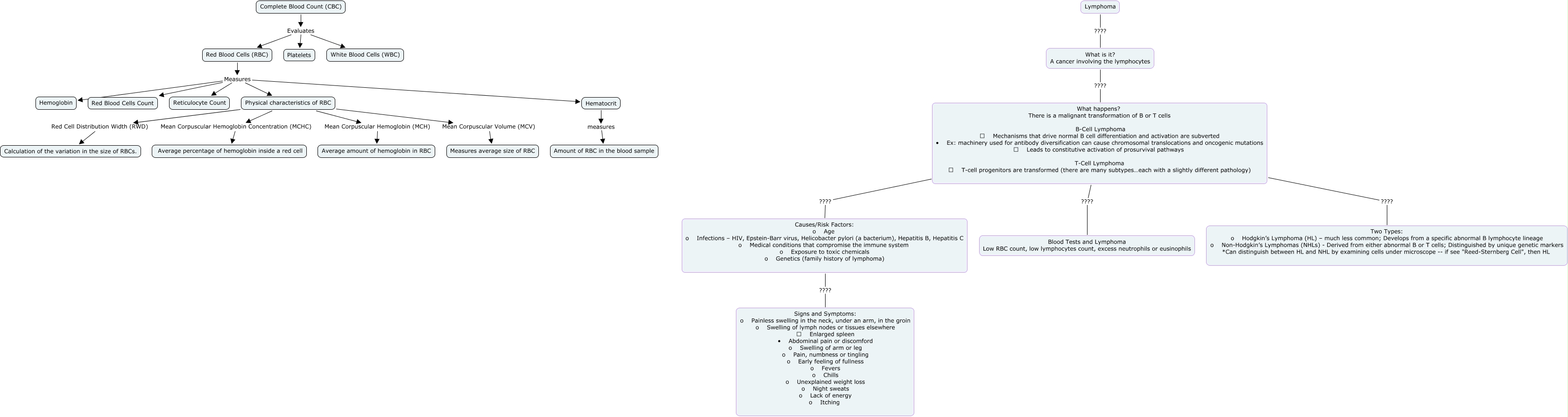 This Concept Map, created with IHMC CmapTools, has information related to: Jumping Genes Frank, Lymphoma ???? What is it? A cancer involving the lymphocytes, Complete Blood Count (CBC) Evaluates Platelets, Physical characteristics of RBC Mean Corpuscular Hemoglobin Concentration (MCHC) Average percentage of hemoglobin inside a red cell, Red Blood Cells (RBC) Measures Red Blood Cells Count, What is it? A cancer involving the lymphocytes ???? What happens? There is a malignant transformation of B or T cells B-Cell Lymphoma Mechanisms that drive normal B cell differentiation and activation are subverted • Ex: machinery used for antibody diversification can cause chromosomal translocations and oncogenic mutations Leads to constitutive activation of prosurvival pathways T-Cell Lymphoma T-cell progenitors are transformed (there are many subtypes…each with a slightly different pathology), Red Blood Cells (RBC) Measures Hemoglobin, What happens? There is a malignant transformation of B or T cells B-Cell Lymphoma Mechanisms that drive normal B cell differentiation and activation are subverted • Ex: machinery used for antibody diversification can cause chromosomal translocations and oncogenic mutations Leads to constitutive activation of prosurvival pathways T-Cell Lymphoma T-cell progenitors are transformed (there are many subtypes…each with a slightly different pathology) ???? Blood Tests and Lymphoma Low RBC count, low lymphocytes count, excess neutrophils or eusinophils, Physical characteristics of RBC Mean Corpuscular Volume (MCV) Measures average size of RBC, Red Blood Cells (RBC) Measures Physical characteristics of RBC, Physical characteristics of RBC Mean Corpuscular Hemoglobin (MCH) Average amount of hemoglobin in RBC, What happens? There is a malignant transformation of B or T cells B-Cell Lymphoma Mechanisms that drive normal B cell differentiation and activation are subverted • Ex: machinery used for antibody diversification can cause chromosomal translocations and oncogenic mutations Leads to constitutive activation of prosurvival pathways T-Cell Lymphoma T-cell progenitors are transformed (there are many subtypes…each with a slightly different pathology) ???? Two Types: o Hodgkin’s Lymphoma (HL) – much less common; Develops from a specific abnormal B lymphocyte lineage o Non-Hodgkin’s Lymphomas (NHLs) - Derived from either abnormal B or T cells; Distinguished by unique genetic markers *Can distinguish between HL and NHL by examining cells under microscope -- if see "Reed-Sternberg Cell", then HL, Physical characteristics of RBC Red Cell Distribution Width (RWD) Calculation of the variation in the size of RBCs., Causes/Risk Factors: o Age o Infections – HIV, Epstein-Barr virus, Helicobacter pylori (a bacterium), Hepatitis B, Hepatitis C o Medical conditions that compromise the immune system o Exposure to toxic chemicals o Genetics (family history of lymphoma) ???? Signs and Symptoms: o Painless swelling in the neck, under an arm, in the groin o Swelling of lymph nodes or tissues elsewhere Enlarged spleen • Abdominal pain or discomford o Swelling of arm or leg o Pain, numbness or tingling o Early feeling of fullness o Fevers o Chills o Unexplained weight loss o Night sweats o Lack of energy o Itching, Red Blood Cells (RBC) Measures Reticulocyte Count, Complete Blood Count (CBC) Evaluates Red Blood Cells (RBC), Hematocrit measures Amount of RBC in the blood sample, Complete Blood Count (CBC) Evaluates White Blood Cells (WBC), Red Blood Cells (RBC) Measures Hematocrit, What happens? There is a malignant transformation of B or T cells B-Cell Lymphoma Mechanisms that drive normal B cell differentiation and activation are subverted • Ex: machinery used for antibody diversification can cause chromosomal translocations and oncogenic mutations Leads to constitutive activation of prosurvival pathways T-Cell Lymphoma T-cell progenitors are transformed (there are many subtypes…each with a slightly different pathology) ???? Causes/Risk Factors: o Age o Infections – HIV, Epstein-Barr virus, Helicobacter pylori (a bacterium), Hepatitis B, Hepatitis C o Medical conditions that compromise the immune system o Exposure to toxic chemicals o Genetics (family history of lymphoma)
