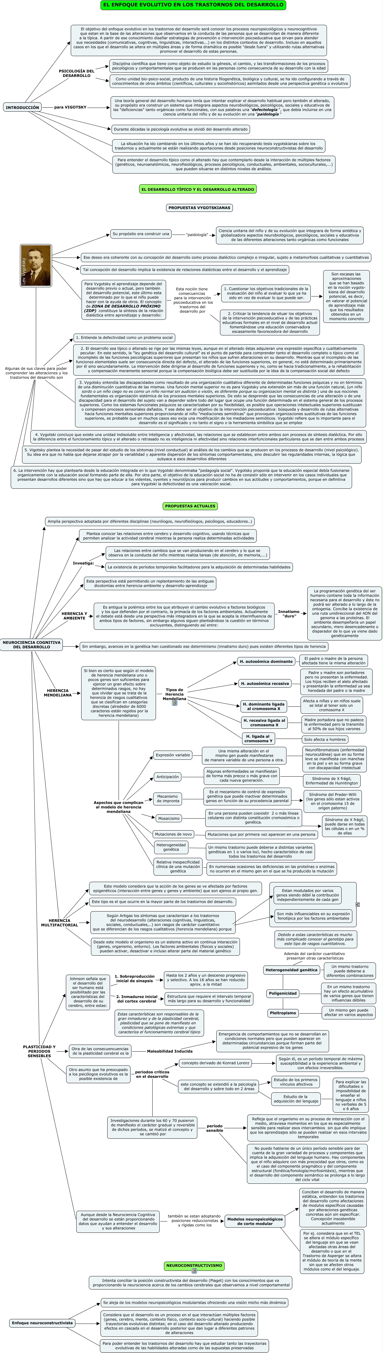 Este Cmap, tiene información relacionada con: MAPA_RESUMEN_ALTERACIONES_DEL_DESARROLLO_VOL2_1, NEUROCIENCIA COGNITIVA DEL DESARROLLO Investiga: La existencia de períodos temporales facilitadores para la adquisición de determinadas habilidades, NEUROCIENCIA COGNITIVA DEL DESARROLLO PLASTICIDAD Y PERIODOS SENSIBLES Johnson señala que el desarrollo del ser humano está posibilitado por las características del desarrollo de su cerebro, entre estas:, Algunas enfermedades se manifiestan de forma más precoz o más grave con cada nueva generación. ???? Síndrome de X frágil, Enfermedad de Hunntington, Enfoque neuroconstructivista ???? Considera que el desarrollo es un proceso en el que interactúan múltiples factores (genes, cerebro, mente, contexto físico, contexto socio-cultural) haciendo posible trayectorias evolutivas distintas; en el caso del desarrollo alterado produciendo efectos en cascada en el desarrollo posterior que dan lugar a diferentes patrones de alteraciones, Johnson señala que el desarrollo del ser humano está posibilitado por las características del desarrollo de su cerebro, entre estas: 1. Sobreproducción inicial de sinapsis Hasta los 2 años y un descenso progresivo y selectivo. A los 16 años se han reducido aprox. a la mitad, Si bien es cierto que según el modelo de herencia mendeliana uno o pocos genes son suficientes para ejercer un gran efecto sobre determinados rasgos, no hay que olvidar que se trata de la herencia de rasgos cualitativos que se clasifican en categorías discretas (alrededor de 6000 caracteres están regidos por la herencia mendeliana) Aspectos que complican al modelo de herencia mendeliana Mecanismo de impronta, Mutaciones de novo ???? Mutaciones que por primera vez aparecen en una persona, Algunas de sus claves para poder comprender las alteraciones y los trastornos del desarrollo son 1. Entiende la defectividad como un problema social, H. ligada al cromosoma Y ???? Solo afecta a hombres, concepto derivado de Konrad Lorenz ???? Según él, es un período temporal de máxima susceptibilidad a la experiencia ambiental y con efectos irreversibles., Si bien es cierto que según el modelo de herencia mendeliana uno o pocos genes son suficientes para ejercer un gran efecto sobre determinados rasgos, no hay que olvidar que se trata de la herencia de rasgos cualitativos que se clasifican en categorías discretas (alrededor de 6000 caracteres están regidos por la herencia mendeliana) Aspectos que complican al modelo de herencia mendeliana Heterogeneidad genética, ???? Tal concepción del desarrollo implica la existencia de relaciones dialécticas entre el desarrollo y el aprendizaje, Si bien es cierto que según el modelo de herencia mendeliana uno o pocos genes son suficientes para ejercer un gran efecto sobre determinados rasgos, no hay que olvidar que se trata de la herencia de rasgos cualitativos que se clasifican en categorías discretas (alrededor de 6000 caracteres están regidos por la herencia mendeliana) Aspectos que complican al modelo de herencia mendeliana Mosaicismo, En una persona pueden coexistir 2 o más líneas celulares con distinta constitución cromosómica o genética. ???? Síndrome de X frágil, puede darse en todas las células o en un % de ellas, Algunas de sus claves para poder comprender las alteraciones y los trastornos del desarrollo son 4. Vygotski concluye que existe una unidad indisoluble entre inteligencia y afectividad, las relaciones que se establecen entre ambos son procesos de síntesis dialéctica. Por ello la diferencia entre el funcionamiento típico y el alterado o retrasado no es inteligencia ni afectividad sino relaciones interfuncionales particulares que se dan entre ambos procesos, NEUROCIENCIA COGNITIVA DEL DESARROLLO HERENCIA MULTIFACTORIAL Desde este modelo el organismo es un sistema activo en continua interacción (genes, organismo, entorno). Los factores ambientales (físicos y sociales) pueden activar, desactivar e incluso alterar parte del material genético, 1. Cuestionar los objetivos tradicionales de la evaluación del niño al evaluar lo que ya ha sido en vez de evaluar lo que puede ser. ???? Son escasas las aproximaciones que se han basado en la noción vygots- kiana del desarrollo potencial, es decir, en valorar el potencial de aprendizaje más que los resultados obtenidos en un momento concreto, ???? Para Vygotsky el aprendizaje depende del desarrollo previo o actual, pero también del desarrollo potencial, este último esta determinado por lo que el niño puede hacer con la ayuda de otros. El concepto de ZONA DE DESARROLLO PRÓXIMO (ZDP) constituye la síntesis de la relación dialéctica entre aprendizaje y desarrollo:, Si bien es cierto que según el modelo de herencia mendeliana uno o pocos genes son suficientes para ejercer un gran efecto sobre determinados rasgos, no hay que olvidar que se trata de la herencia de rasgos cualitativos que se clasifican en categorías discretas (alrededor de 6000 caracteres están regidos por la herencia mendeliana) Tipos de Herencia Mendeliana H. autosómica recesiva, ???? Ese deseo era coherente con su concepción del desarrollo como proceso dialéctico complejo e irregular, sujeto a metamorfosis cualitativas y cuantitativas