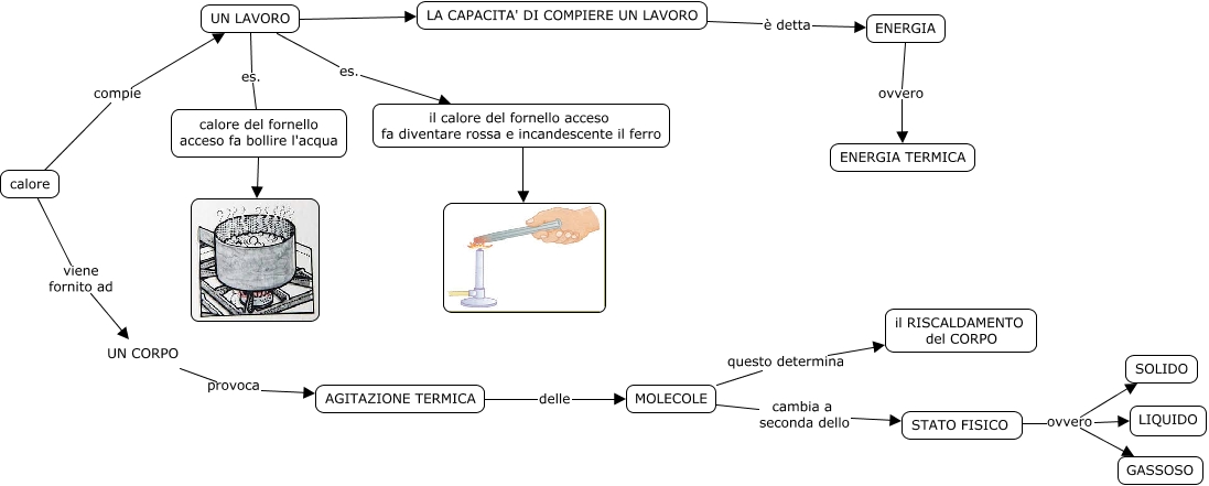 Questa Cmap, creata con IHMC CmapTools, contiene informazioni relative a: calore, AGITAZIONE TERMICA delle MOLECOLE, il calore del fornello acceso fa diventare rossa e incandescente il ferro, calore compie UN LAVORO, calore del fornello acceso fa bollire l'acqua, ENERGIA ovvero ENERGIA TERMICA, UN CORPO provoca AGITAZIONE TERMICA, UN LAVORO es. calore del fornello acceso fa bollire l'acqua, STATO FISICO ovvero SOLIDO, MOLECOLE cambia a seconda dello STATO FISICO, UN LAVORO LA CAPACITA' DI COMPIERE UN LAVORO, STATO FISICO ovvero GASSOSO, STATO FISICO ovvero LIQUIDO, LA CAPACITA' DI COMPIERE UN LAVORO è detta ENERGIA, MOLECOLE questo determina il RISCALDAMENTO del CORPO, UN LAVORO es. il calore del fornello acceso fa diventare rossa e incandescente il ferro, calore viene fornito ad UN CORPO