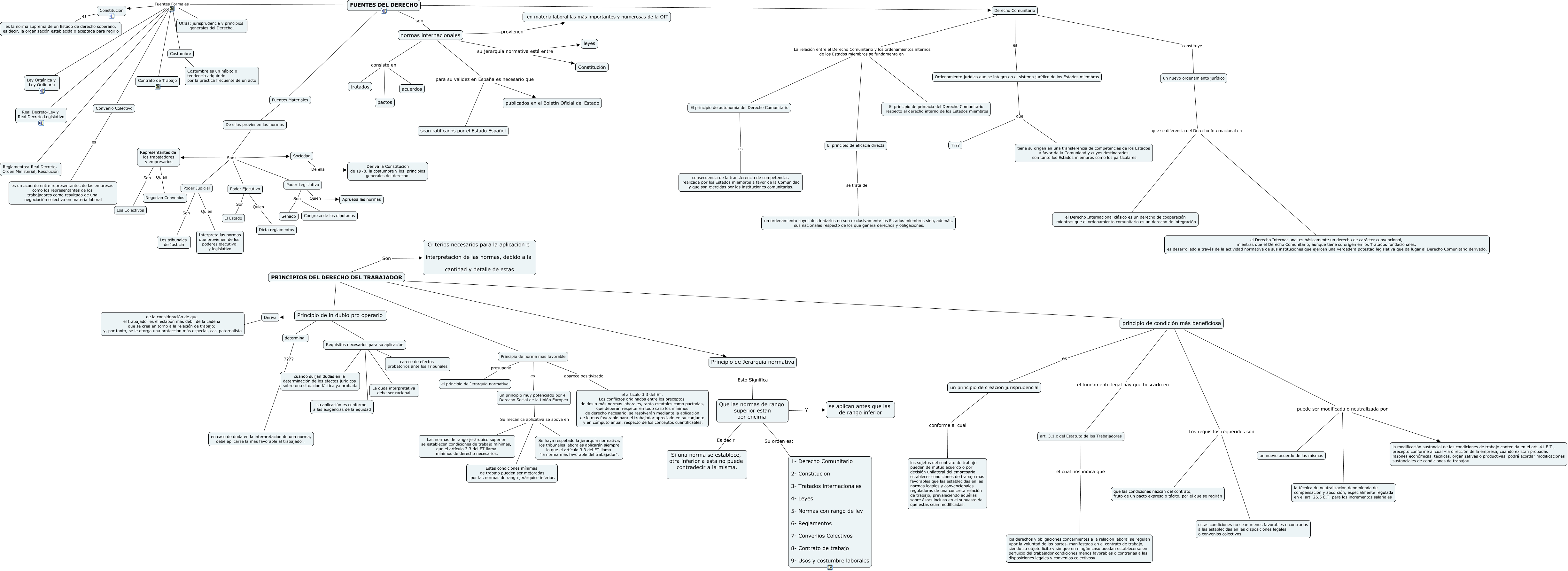 Este Cmap, tiene información relacionada con: Fuentes del Derecho, Que las normas de rango superior estan por encima Es decir Si una norma se establece, otra inferior a esta no puede contradecir a la misma., normas internacionales consiste en pactos, normas internacionales su jerarquía normativa está entre leyes, FUENTES DEL DERECHO Fuentes Formales Reglamentos: Real Decreto, Orden Ministerial, Resolución, principio de condición más beneficiosa es un principio de creación jurisprudencial, Requisitos necesarios para su aplicación ???? carece de efectos probatorios ante los Tribunales, FUENTES DEL DERECHO Fuentes Formales Constitución, PRINCIPIOS DEL DERECHO DEL TRABAJADOR Son Criterios necesarios para la aplicacion e interpretacion de las normas, debido a la cantidad y detalle de estas, un nuevo ordenamiento jurídico que se diferencia del Derecho Internacional en el Derecho Internacional es básicamente un derecho de carácter convencional, mientras que el Derecho Comunitario, aunque tiene su origen en los Tratados fundacionales, es desarrollado a través de la actividad normativa de sus instituciones que ejercen una verdadera potestad legislativa que da lugar al Derecho Comunitario derivado., principio de condición más beneficiosa Los requisitos requeridos son que las condiciones nazcan del contrato, fruto de un pacto expreso o tácito, por el que se regirán, Poder Ejecutivo Quien Dicta reglamentos, FUENTES DEL DERECHO Fuentes Formales Real Decreto-Ley y Real Decreto Legislativo, De ellas provienen las normas Son: Representantes de los trabajadores y empresarios, FUENTES DEL DERECHO ???? Derecho Comunitario, Representantes de los trabajadores y empresarios Son Los Colectivos, Principio de norma más favorable presupone el principio de Jerarquía normativa, FUENTES DEL DERECHO ???? De ellas provienen las normas, normas internacionales para su validez en España es necesario que publicados en el Boletín Oficial del Estado, un principio muy potenciado por el Derecho Social de la Unión Europea Su mecánica aplicativa se apoya en Las normas de rango jerárquico superior se establecen condiciones de trabajo mínimas, que el artículo 3.3 del ET llama mínimos de derecho necesarios., PRINCIPIOS DEL DERECHO DEL TRABAJADOR ???? Principio de in dubio pro operario