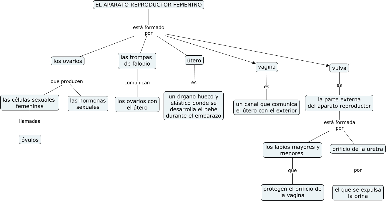 Este Cmap, tiene información relacionada con: EL aparato reproductor femenino, la parte externa del aparato reproductor está formada por orificio de la uretra, las células sexuales femeninas llamadas óvulos, útero es un órgano hueco y elástico donde se desarrolla el bebé durante el embarazo, EL APARATO REPRODUCTOR FEMENINO está formado por las trompas de falopio, EL APARATO REPRODUCTOR FEMENINO está formado por vulva, vulva es la parte externa del aparato reproductor, EL APARATO REPRODUCTOR FEMENINO está formado por vagina, EL APARATO REPRODUCTOR FEMENINO está formado por útero, los labios mayores y menores que protegen el orificio de la vagina, las trompas de falopio comunican los ovarios con el útero, los ovarios que producen las células sexuales femeninas, la parte externa del aparato reproductor está formada por los labios mayores y menores, orificio de la uretra por el que se expulsa la orina, los ovarios que producen las hormonas sexuales, EL APARATO REPRODUCTOR FEMENINO está formado por los ovarios, vagina es un canal que comunica el útero con el exterior