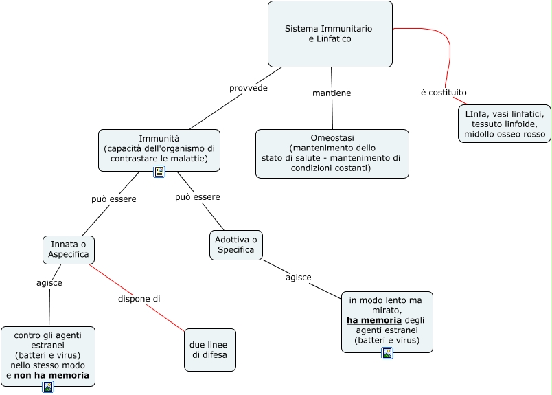 Questa Cmap, creata con IHMC CmapTools, contiene informazioni relative a: Immunità, Innata o Aspecifica dispone di due linee di difesa, Sistema Immunitario e Linfatico è costituito LInfa, vasi linfatici, tessuto linfoide, midollo osseo rosso, Immunità (capacità dell'organismo di contrastare le malattie) può essere Innata o Aspecifica, Sistema Immunitario e Linfatico mantiene Omeostasi (mantenimento dello stato di salute - mantenimento di condizioni costanti), Innata o Aspecifica agisce contro gli agenti estranei (batteri e virus) nello stesso modo e non ha memoria, Sistema Immunitario e Linfatico provvede Immunità (capacità dell'organismo di contrastare le malattie), Immunità (capacità dell'organismo di contrastare le malattie) può essere Adottiva o Specifica, Adottiva o Specifica agisce in modo lento ma mirato, ha memoria degli agenti estranei (batteri e virus)