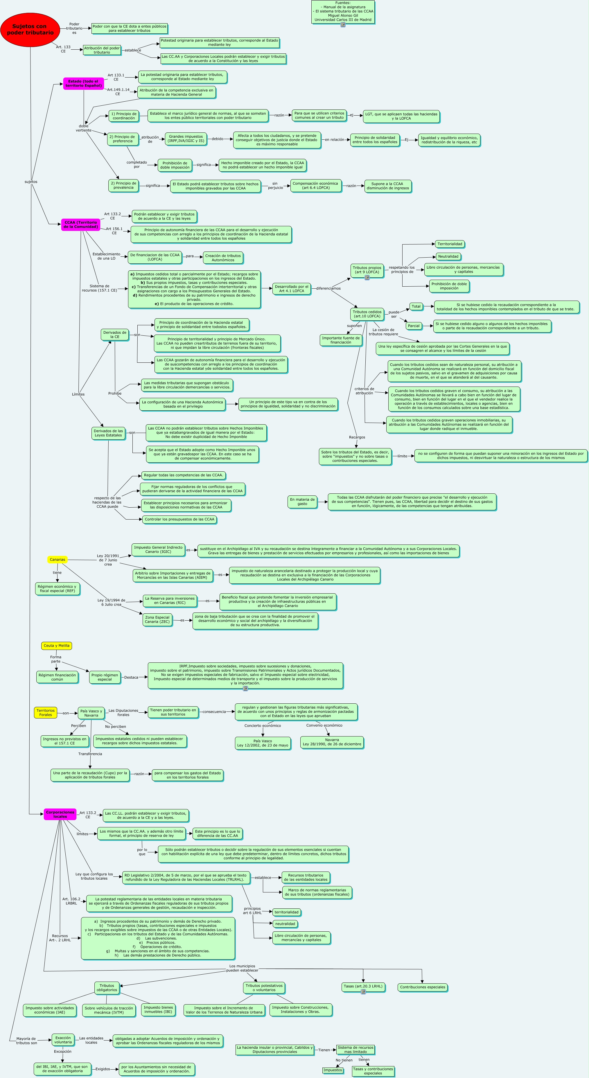 Este Cmap, tiene información relacionada con: Sujetos con poder, Una parte de la recaudación (Cupo) por la aplicación de tributos forales razón para compensar los gastos del Estado en los territorios forales, Corporaciones locales Los municipios pueden establecer Tasas (art.20.3 LRHL), Grandes impuestos (IRPF,IVA/IGIC y IS) debido Afecta a todos los ciudadanos, y se pretende conseguir objetivos de justcia donde el Estado es máximo responsable, Los mismos que la CC.AA. y además otro límite formal, el principio de reserva de ley por lo que Sólo podrán establecer tributos o decidir sobre la regulación de sus elementos esenciales si cuentan con habilitación explícita de una ley que debe predeterminar, dentro de límites concretos, dichos tributos conforme al principio de legalidad., País Vasco y Navarra Transferencia Una parte de la recaudación (Cupo) por la aplicación de tributos forales, Tributos cedidos (art.10 LOFCA) puede ser Total, Propio régimen especial Destaca IRPF,Impuesto sobre sociedades, impuesto sobre sucesiones y donaciones, impuesto sobre el patrimonio, impuesto sobre Transmisiones Patrimoniales y Actos jurídicos Documentados, No se exigen impuestos especiales de fabricación, salvo el Impuesto especial sobre electricidad, Impuesto especial de determinados medios de transporte y el impuesto sobre la producción de servicios y la importación., Canarias Ley 20/1991 de 7 Junio crea Arbitrio sobre Importaciones y entregas de Mercancías en las Islas Canarias (AIEM), Sistema de recursos mas limitado tienen Tasas y contribuciones especiales, Tienen poder tributario en sus territorios consecuencia regulan y gestionan las figuras tributarias más significativas, de acuerdo con unos principios y reglas de armonización pactadas con el Estado en las leyes que aprueban, Corporaciones locales Mayoría de tributos son Exacción voluntaria, Establece el marco jurídico general de normas, al que se someten los entes público territoriales con poder tributario razón Para que se utilicen criterios comunes al crear un tributo, De financiacion de las CCAA (LOFCA) para Creación de tributos Autonómicos, Sistema de recursos mas limitado No tienen Impuestos, Ceuta y Melilla Forma parte Régimen financiación común, 2) Principio de preferencia completado por Prohibición de doble imposición, Corporaciones locales Art. 106.2 LRBRL La potestad reglamentaria de las entidades locales en materia tributaria se ejercerá a través de Ordenanzas fiscales reguladoras de sus tributos propios y de Ordenanzas generales de gestión, recaudación e inspección., Tributos obligatorios ???? Impuesto bienes inmuebles (IBI), del IBI, IAE, y IVTM, que son de exacción obligatoria Exigidos por los Ayuntamientos sin necesidad de Acuerdos de imposición y ordenación., Tributos cedidos (art.10 LOFCA) La cesión de tributos requiere Una ley específica de cesión aprobada por las Cortes Generales en la que se consagren el alcance y los límites de la cesión