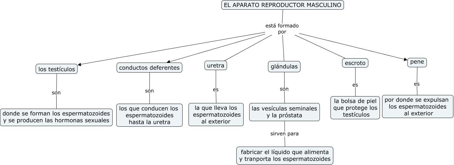 Este Cmap, tiene información relacionada con: El aparato reproductor masculino, escroto es la bolsa de piel que protege los testículos, EL APARATO REPRODUCTOR MASCULINO está formado por los testículos, conductos deferentes son los que conducen los espermatozoides hasta la uretra, EL APARATO REPRODUCTOR MASCULINO está formado por pene, EL APARATO REPRODUCTOR MASCULINO está formado por glándulas, uretra es la que lleva los espermatozoides al exterior, EL APARATO REPRODUCTOR MASCULINO está formado por uretra, EL APARATO REPRODUCTOR MASCULINO está formado por conductos deferentes, pene es por donde se expulsan los espermatozoides al exterior, los testículos son donde se forman los espermatozoides y se producen las hormonas sexuales, las vesículas seminales y la próstata sirven para fabricar el líquido que alimenta y tranporta los espermatozoides, glándulas son las vesículas seminales y la próstata, EL APARATO REPRODUCTOR MASCULINO está formado por escroto