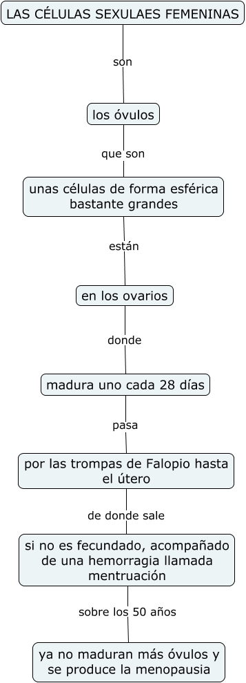 Este Cmap, tiene información relacionada con: Las células sexuales femeninas, en los ovarios donde madura uno cada 28 días, si no es fecundado, acompañado de una hemorragia llamada mentruación sobre los 50 años ya no maduran más óvulos y se produce la menopausia, por las trompas de Falopio hasta el útero de donde sale si no es fecundado, acompañado de una hemorragia llamada mentruación, LAS CÉLULAS SEXULAES FEMENINAS son los óvulos, los óvulos que son unas células de forma esférica bastante grandes, madura uno cada 28 días pasa por las trompas de Falopio hasta el útero, unas células de forma esférica bastante grandes están en los ovarios