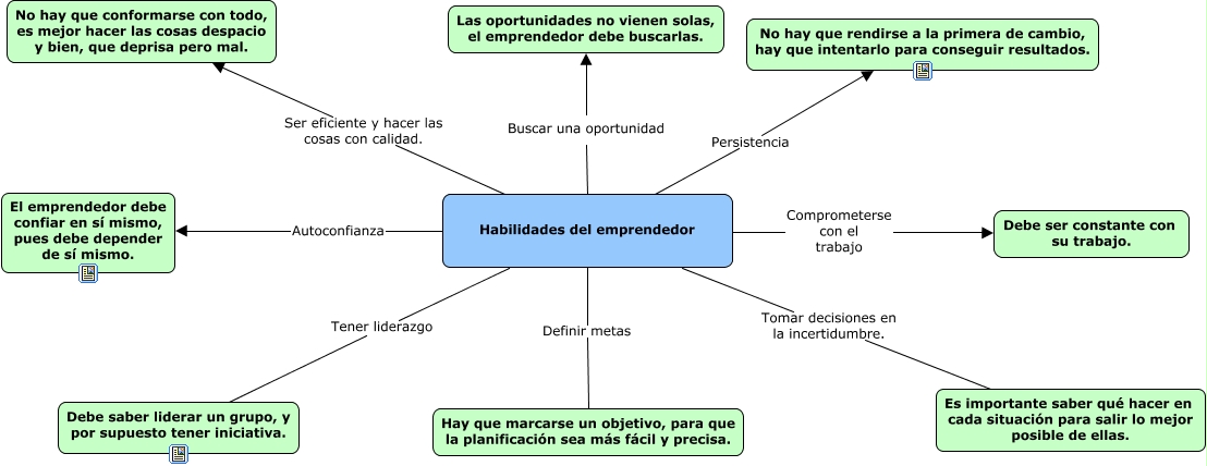 Este Cmap, tiene información relacionada con: Emprendedor y características, Habilidades del emprendedor Persistencia No hay que rendirse a la primera de cambio, hay que intentarlo para conseguir resultados., Habilidades del emprendedor Comprometerse con el trabajo Debe ser constante con su trabajo., Habilidades del emprendedor Definir metas Hay que marcarse un objetivo, para que la planificación sea más fácil y precisa., Habilidades del emprendedor Tomar decisiones en la incertidumbre. Es importante saber qué hacer en cada situación para salir lo mejor posible de ellas., Habilidades del emprendedor Tener liderazgo Debe saber liderar un grupo, y por supuesto tener iniciativa., Habilidades del emprendedor Autoconfianza El emprendedor debe confiar en sí mismo, pues debe depender de sí mismo., Habilidades del emprendedor Buscar una oportunidad Las oportunidades no vienen solas, el emprendedor debe buscarlas., Habilidades del emprendedor Ser eficiente y hacer las cosas con calidad. No hay que conformarse con todo, es mejor hacer las cosas despacio y bien, que deprisa pero mal.
