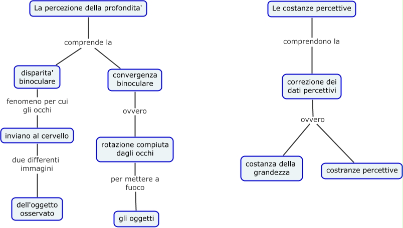 Questa Cmap, creata con IHMC CmapTools, contiene informazioni relative a: La percezione della profondità, rotazione compiuta dagli occhi per mettere a fuoco gli oggetti, inviano al cervello due differenti immagini dell'oggetto osservato, disparita' binoculare fenomeno per cui gli occhi inviano al cervello, La percezione della profondita' comprende la disparita' binoculare, correzione dei dati percettivi ovvero costranze percettive, Le costanze percettive comprendono la correzione dei dati percettivi, correzione dei dati percettivi ovvero costanza della grandezza, convergenza binoculare ovvero rotazione compiuta dagli occhi, La percezione della profondita' comprende la convergenza binoculare