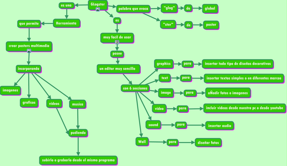Este Cmap, tiene información relacionada con: glogster, GLogster palabra que evoca "ster", un editor muy sencillo con 6 secciones graphics, videos pudiendo subirlo o grabarlo desde el mismo programa, Wall para diseñar fotos, sound para insertar audio, un editor muy sencillo con 6 secciones video, un editor muy sencillo con 6 secciones image, musica pudiendo subirlo o grabarlo desde el mismo programa, un editor muy sencillo con 6 secciones text, GLogster es una Herramienta, crear posters multimedia incorporando graficos, "ster" de poster, text para insertar textos simples o en diferentes marcos, "glog" de global, GLogster palabra que evoca "glog", image para aÑadir fotos o imagenes, crear posters multimedia incorporando musica, crear posters multimedia incorporando videos, muy facil de usar posee un editor muy sencillo, Herramienta que permite crear posters multimedia