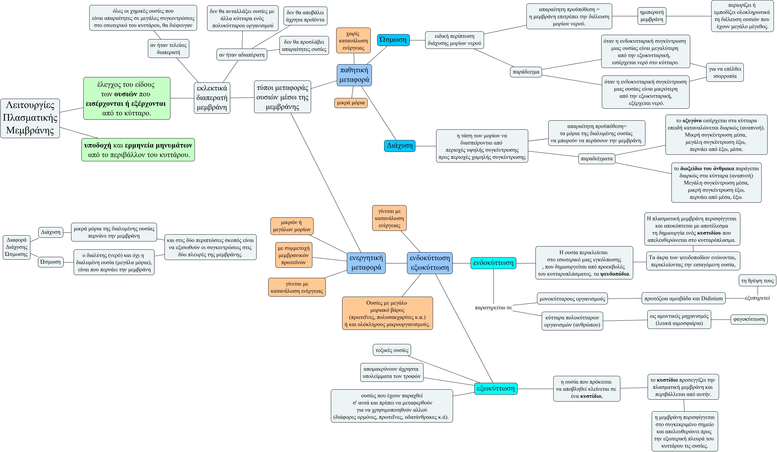 Αυτός ο εννοιολογικός χάρτης, που δημιουργήθηκε με το IHMC Cmap Tools, περιέχει πλήροφορίες που σχετίζονται με: Leitourgies_membranon, ενδοκύττωση παρατηρείται σε μονοκύτταρους οργανισμούς, ενδοκύττωση εξωκύττωση γίνεται με κατανάλωση ενέργειας, αν ήταν αδιαπέρατη δεν θα αποβάλει άχρητα προϊόντα, παθητική μεταφορά μικρά μόρια, τύποι μεταφοράς ουσιών μέσω της μεμβράνης ενεργητική μεταφορά, Η ουσία περικλείεται στο εσωτερικό μιας εγκόλπωσης , που δημιουργείται από προεκβολές του κυτταροπλάσματος. τα ψευδοπόδια. Τα άκρα των ψευδοποδίων ενώνονται, περικλείοντας την εισαγόμενη ουσία,, ειδική περίπτωση διάχυσης μορίων νερού παράδειγμα, η τάση των μορίων να διασπείρονται από περιοχές υψηλής συγκέντρωσης προς περιοχές χαμηλής συγκέντρωσης παραδείγματα, παραδείγματα το οξυγόνο εισέρχεται στα κύτταρα επειδή καταναλώνεται διαρκώς (αναπνοή). Μικρή συγκέντρωση μέσα, μεγάλη συγκέντρωση έξω, περνάει από έξω, μέσα., Διάχυση μικρά μόρια της διαλυμένης ουσίας περνάνε την μεμβράνη, Ώσμωση ο διαλύτης (νερό) και όχι η διαλυμένη ουσία (μεγάλα μόρια), είναι που περνάει την μεμβράνη, Διάχυση η τάση των μορίων να διασπείρονται από περιοχές υψηλής συγκέντρωσης προς περιοχές χαμηλής συγκέντρωσης, το κυστίδιο προσεγγίζει την πλασματική μεμβράνη και περιβάλλεται από αυτήν. η μεμβράνη περισφίγγεται στο συγκεκριμένο σημείο και απελευθερώνει προς την εξωτερική πλευρά του κυττάρου τις ουσίες., εξωκύττωση απομακρύνουν άχρηστα υπολείμματα των τροφών, Ώσμωση ειδική περίπτωση διάχυσης μορίων νερού, τύποι μεταφοράς ουσιών μέσω της μεμβράνης παθητική μεταφορά, ενδοκύττωση εξωκύττωση ενδοκύττωση, απαραίτητη προϋπόθεση = η μεμβράνη επιτρέπει την διέλευση μορίων νερού. ημιπερατή μεμβράνη, ενδοκύττωση εξωκύττωση Ουσίες με μεγάλο μοριακό βάρος (πρωτεΐνες, πολυσακχαρίτες κ.α.) ή και ολόκληρους μικροοργανισμούς., εξωκύττωση ουσίες που έχουν παραχθεί σ' αυτά και πρέπει να μεταφερθούν για να χρησιμοποιηθούν αλλού (διάφορες ορμόνες, πρωτεΐνες, υδατάνθρακες κ.ά).