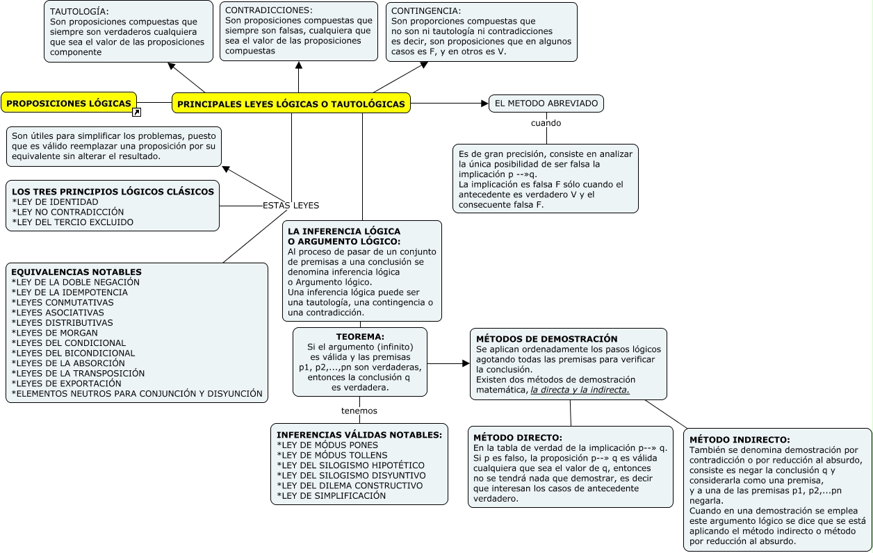 Este Cmap, tiene información relacionada con: PRINCIPALES LEYES LÓGICAS O TAUTOLÓGICAS, EL METODO ABREVIADO cuando Es de gran precisión, consiste en analizar la única posibilidad de ser falsa la implicación p --»q. La implicación es falsa F sólo cuando el antecedente es verdadero V y el consecuente falsa F., TEOREMA: Si el argumento (infinito) es válida y las premisas p1, p2,...,pn son verdaderas, entonces la conclusión q es verdadera. ???? MÉTODOS DE DEMOSTRACIÓN Se aplican ordenadamente los pasos lógicos agotando todas las premisas para verificar la conclusión. Existen dos métodos de demostración matemática, la directa y la indirecta., MÉTODOS DE DEMOSTRACIÓN Se aplican ordenadamente los pasos lógicos agotando todas las premisas para verificar la conclusión. Existen dos métodos de demostración matemática, la directa y la indirecta. ???? MÉTODO INDIRECTO: También se denomina demostración por contradicción o por reducción al absurdo, consiste es negar la conclusión q y considerarla como una premisa, y a una de las premisas p1, p2,...pn negarla. Cuando en una demostración se emplea este argumento lógico se dice que se está aplicando el método indirecto o método por reducción al absurdo., PRINCIPALES LEYES LÓGICAS O TAUTOLÓGICAS ESTAS LEYES Son útiles para simplificar los problemas, puesto que es válido reemplazar una proposición por su equivalente sin alterar el resultado., PRINCIPALES LEYES LÓGICAS O TAUTOLÓGICAS ???? EL METODO ABREVIADO, PRINCIPALES LEYES LÓGICAS O TAUTOLÓGICAS ???? CONTINGENCIA: Son proporciones compuestas que no son ni tautología ni contradicciones es decir, son proposiciones que en algunos casos es F, y en otros es V., PROPOSICIONES LÓGICAS . PRINCIPALES LEYES LÓGICAS O TAUTOLÓGICAS, PRINCIPALES LEYES LÓGICAS O TAUTOLÓGICAS ???? LA INFERENCIA LÓGICA O ARGUMENTO LÓGICO: Al proceso de pasar de un conjunto de premisas a una conclusión se denomina inferencia lógica o Argumento lógico. Una inferencia lógica puede ser una tautología, una contingencia o una contradicción., PRINCIPALES LEYES LÓGICAS O TAUTOLÓGICAS ???? TAUTOLOGÍA: Son proposiciones compuestas que siempre son verdaderos cualquiera que sea el valor de las proposiciones componente, LA INFERENCIA LÓGICA O ARGUMENTO LÓGICO: Al proceso de pasar de un conjunto de premisas a una conclusión se denomina inferencia lógica o Argumento lógico. Una inferencia lógica puede ser una tautología, una contingencia o una contradicción. ???? TEOREMA: Si el argumento (infinito) es válida y las premisas p1, p2,...,pn son verdaderas, entonces la conclusión q es verdadera., TEOREMA: Si el argumento (infinito) es válida y las premisas p1, p2,...,pn son verdaderas, entonces la conclusión q es verdadera. tenemos INFERENCIAS VÁLIDAS NOTABLES: *LEY DE MÓDUS PONES *LEY DE MÓDUS TOLLENS *LEY DEL SILOGISMO HIPOTÉTICO *LEY DEL SILOGISMO DISYUNTIVO *LEY DEL DILEMA CONSTRUCTIVO *LEY DE SIMPLIFICACIÓN, MÉTODOS DE DEMOSTRACIÓN Se aplican ordenadamente los pasos lógicos agotando todas las premisas para verificar la conclusión. Existen dos métodos de demostración matemática, la directa y la indirecta. ???? MÉTODO DIRECTO: En la tabla de verdad de la implicación p--» q. Si p es falso, la proposición p--» q es válida cualquiera que sea el valor de q, entonces no se tendrá nada que demostrar, es decir que interesan los casos de antecedente verdadero., LOS TRES PRINCIPIOS LÓGICOS CLÁSICOS *LEY DE IDENTIDAD *LEY NO CONTRADICCIÓN *LEY DEL TERCIO EXCLUIDO ESTAS LEYES Son útiles para simplificar los problemas, puesto que es válido reemplazar una proposición por su equivalente sin alterar el resultado., EQUIVALENCIAS NOTABLES *LEY DE LA DOBLE NEGACIÓN *LEY DE LA IDEMPOTENCIA *LEYES CONMUTATIVAS *LEYES ASOCIATIVAS *LEYES DISTRIBUTIVAS *LEYES DE MORGAN *LEYES DEL CONDICIONAL *LEYES DEL BICONDICIONAL *LEYES DE LA ABSORCIÓN *LEYES DE LA TRANSPOSICIÓN *LEYES DE EXPORTACIÓN *ELEMENTOS NEUTROS PARA CONJUNCIÓN Y DISYUNCIÓN ESTAS LEYES Son útiles para simplificar los problemas, puesto que es válido reemplazar una proposición por su equivalente sin alterar el resultado., PRINCIPALES LEYES LÓGICAS O TAUTOLÓGICAS ???? CONTRADICCIONES: Son proposiciones compuestas que siempre son falsas, cualquiera que sea el valor de las proposiciones compuestas