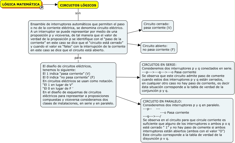 Este Cmap, tiene información relacionada con: CIRCUITOS LÓGICOS, Ensamble de interruptores automáticos que permiten el paso o no de la corriente eléctrica, se denomina circuito eléctrico. A un interruptor se puede representar por medio de una proposición p y viceversa, de tal manera que el valor de verdad de la proposición p se identifique con el “paso de la corriente” en este caso se dice que el “circuito está cerrado” y cuando el valor es “falso" con la interrupción de la corriente en este caso se dice que el circuito está abierto. para El diseño de circuitos eléctricos, tenemos lo siguiente: El 1 indica “pasa corriente” (V) El 0 indica "no pasa corriente” (F) En circuitos eléctricos se usan como notación. “El 1 en lugar de V” “El 0 en lugar de F ’ En el diseño de esquemas de circuitos eléctricos para representar a proposiciones compuestas y viceversa consideramos dos clases de instalaciones, en serie y en paralelo., El diseño de circuitos eléctricos, tenemos lo siguiente: El 1 indica “pasa corriente” (V) El 0 indica "no pasa corriente” (F) En circuitos eléctricos se usan como notación. “El 1 en lugar de V” “El 0 en lugar de F ’ En el diseño de esquemas de circuitos eléctricos para representar a proposiciones compuestas y viceversa consideramos dos clases de instalaciones, en serie y en paralelo. ???? CIRCUITO EN PARALELO: Consideremos dos interruptores p y q en paralelo. ---p-- --- ---o Pasa corriente ---q--->---/ Se observa en el circuito para que circule corriente es suficiente que alguno de los interruptores o ambos p o q esté cerrado “ 1” y no hay paso de comente si ambos interruptores están abiertos (ambos con el valor "O”) Este circuito corresponde a la tabla de verdad de la disyunción p v q., El diseño de circuitos eléctricos, tenemos lo siguiente: El 1 indica “pasa corriente” (V) El 0 indica "no pasa corriente” (F) En circuitos eléctricos se usan como notación. “El 1 en lugar de V” “El 0 en lugar de F ’ En el diseño de esquemas de circuitos eléctricos para representar a proposiciones compuestas y viceversa consideramos dos clases de instalaciones, en serie y en paralelo. ???? CIRCUITOS EN SERIE: Consideremos dos interruptores p y q conectados en serie. ---p--->---q--->---o Pasa corriente Se observa que este circuito admite paso de comente cuando estos dos interruptores p y q están cerrados, en cualquier otro caso no hay paso de corriente, es decir ésta situación corresponde a la tabla de verdad de la conjunción p y q., Ensamble de interruptores automáticos que permiten el paso o no de la corriente eléctrica, se denomina circuito eléctrico. A un interruptor se puede representar por medio de una proposición p y viceversa, de tal manera que el valor de verdad de la proposición p se identifique con el “paso de la corriente” en este caso se dice que el “circuito está cerrado” y cuando el valor es “falso" con la interrupción de la corriente en este caso se dice que el circuito está abierto. ???? Circuito cerrado: pasa corriente (V), CIRCUITOS LÓGICOS son Ensamble de interruptores automáticos que permiten el paso o no de la corriente eléctrica, se denomina circuito eléctrico. A un interruptor se puede representar por medio de una proposición p y viceversa, de tal manera que el valor de verdad de la proposición p se identifique con el “paso de la corriente” en este caso se dice que el “circuito está cerrado” y cuando el valor es “falso" con la interrupción de la corriente en este caso se dice que el circuito está abierto., Ensamble de interruptores automáticos que permiten el paso o no de la corriente eléctrica, se denomina circuito eléctrico. A un interruptor se puede representar por medio de una proposición p y viceversa, de tal manera que el valor de verdad de la proposición p se identifique con el “paso de la corriente” en este caso se dice que el “circuito está cerrado” y cuando el valor es “falso" con la interrupción de la corriente en este caso se dice que el circuito está abierto. ???? Circuito abierto: no pasa corriente (F), LÓGICA MATEMÁTICA ???? CIRCUITOS LÓGICOS